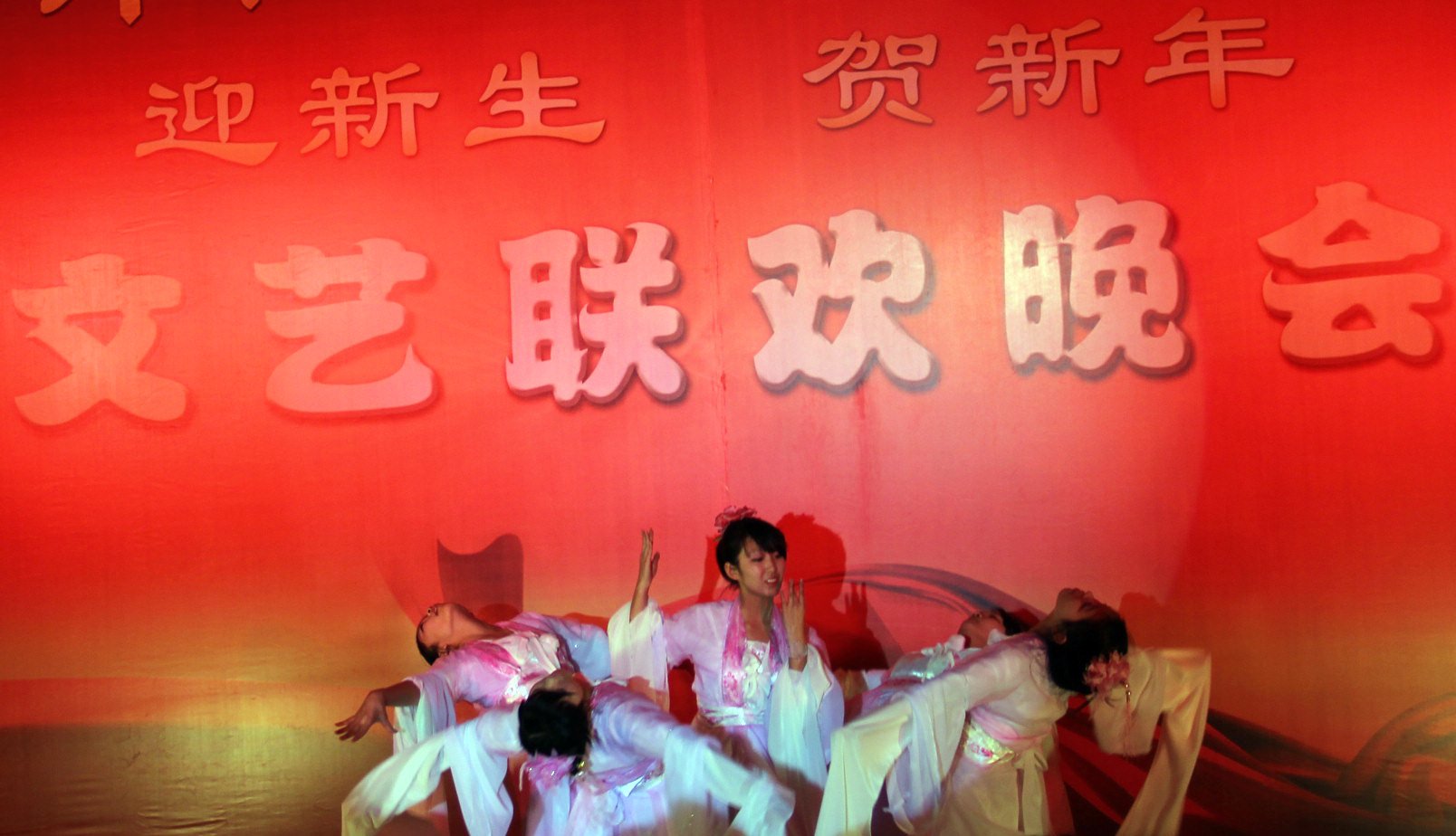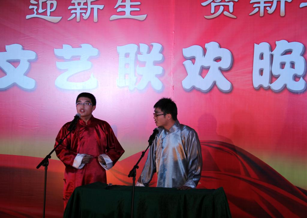 晚会在学生制作的精彩视频短片中拉开帷幕,视频回顾了2012级新生入学报到、军训阅兵、文体活动、学习生活等精彩片段。学院院长马永庆首先进行新年致辞。在致辞中,马永庆回顾了学院历史发展、介绍了学院系部设置等,代表全体师生表达了对2012级新生的热烈欢迎,送上新年祝福并对同学们提出了殷切希望。伴随着动感时尚、活力四射的开场舞《NUABO》,联欢晚会正式开始。晚会融合舞蹈、话剧、歌曲、相声、器乐演奏等多种表演形式,精彩纷呈,好戏连连。2012级新生带来青春动感的情景歌舞剧《怒放的青春》,展现了大一新生欲以青春与梦想书写美好未来的畅想;韵律优美、节奏明快的健美操表演展现了我院学子健康向上、朝气蓬勃的精神面貌;传统文化的融入也为现场观众带来新的视听体验;蕴含着深厚文化气息的武术表演《行云流水》,动感而富有激情,虎虎生风、振奋人心;舞蹈乐器表演《青花瓷》,乐曲演奏婉转悠扬,古典舞蹈表演优雅柔美,充分展现出我院师生的卓越才艺,精彩的表演让同学们如痴如醉、流连忘返;传统的对口相声《大保镖》其幽默诙谐的语言,接连不断的包袱儿引得观众捧腹大笑;话剧《非诚勿扰》则将骑马舞等各种时尚流行元素集于一体,幽默的台词、诙谐而富有创意的表演,掀起了现场的小高潮。蕴含浓郁民族风情云南舞蹈《孔雀飞来》、《彩蝶飞花》,新疆舞蹈《美丽的姑娘》以及各民族混搭的《最炫民族风》,让在场的观众陶醉于少数民族风情中。老师们也不甘示弱、纷纷上台表演,张秀云老师以传统戏曲吕剧《姊妹易嫁》(选段)为大家送上祝福;学院副书记吕晓勇则以一曲《永远跟你走》向党的十八大献礼,浑厚的嗓音赢得掌声、喝彩声不断;《家乡话送祝福》节目中,房增福书记、杨素群、高继文、崔永杰等领导老师纷纷登台,用朴实地道的家乡话给全体师生送上深情祝福,浓浓的暖意感动了在座的全体师生,赢得在座同学尤其是老乡们的阵阵欢呼。