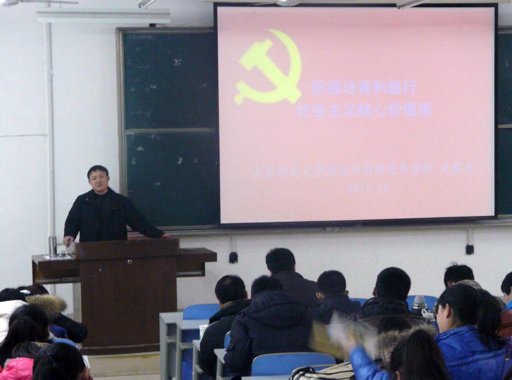 12月13日晚,政治与国际关系学院(马克思主义学院)“三励讲坛”暨学习宣传党的十八大精神系列专题报告会在长清校区综合教学楼C区220教室举行。报告会邀请学校党的十八大精神宣讲团成员、政治与国际关系学院(马克思主义学院)史家亮副教授作了题为“积极培育社会主义核心价值观”的专题报告。学院党委副书记吕晓勇、团总支副书记孙茂泉、2012级辅导员魏强和第46期党基班全体成员以及学生干部代表参加了报告会。报告会由孙茂泉主持。
