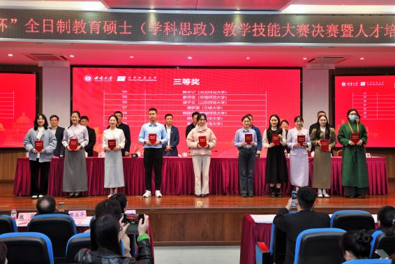 2023年12月1日至3日,由全国教育专业学位研究生教育指导委员会主办的“田家炳杯”全日制教育硕士专业学位研究生(学科教学•思政)教学技能大赛决赛在西南大学举行,决赛共有来自西南大学、山东师范大学、华中师范大学、首都师范大学等全国75所院校的188名选手参加。我院学科教学(思政)研究生参赛选手表现不俗,韩雅雯、赵思佳、谭子文获得三等奖,刘梦瑶、于可卿获得优秀教学设计奖。