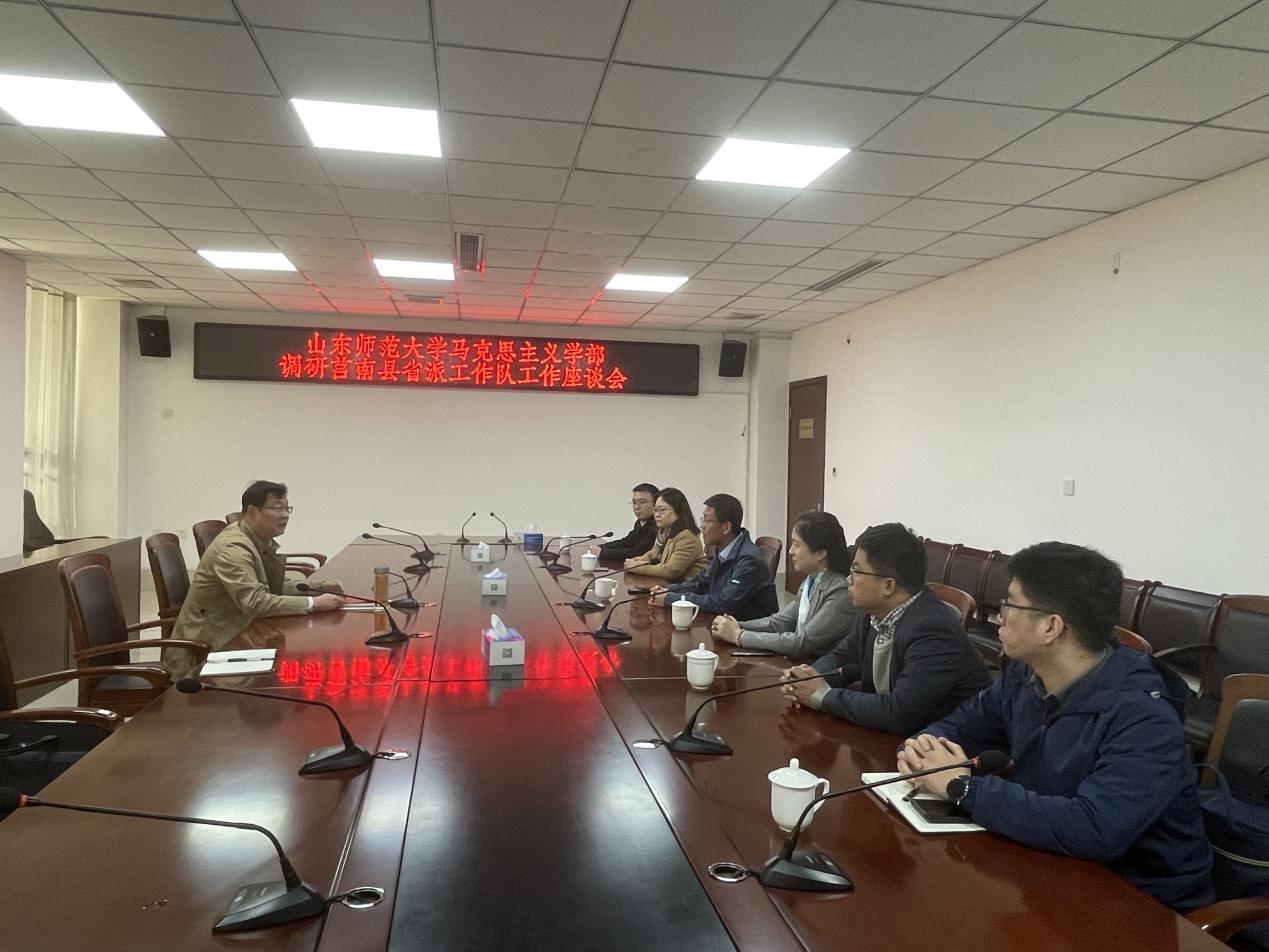 11月6日,马克思主义学部部长王增福,学部党委副书记、纪委书记潘磊,学部部长助理孙余余,学部学工办主任、团委书记李志亮,辅导员范培烁、庞帅康一行6人,前往莒南看望慰问学部省派工作队队员王鑫磊老师,并召开座谈会议。莒南县委副书记(挂职)孙丙高参加活动。