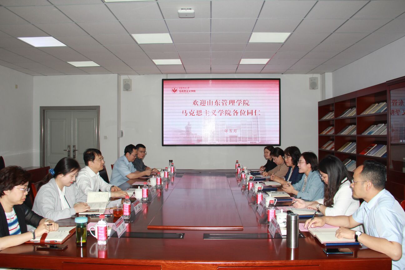 5月25日上午,山东管理学院马克思主义学院党总支书记潘峰,党总支副书记、院长齐敏等一行6人来我院开展调研工作。我院党委书记吕晓勇、院长王增福、党委副书记潘磊、副院长吴春雷、毛泽东思想和中国特色社会主义理论体系概论教研部党支部书记冯芸、习近平新时代中国特色社会主义思想概论教研部主任李长学参加了调研交流会。