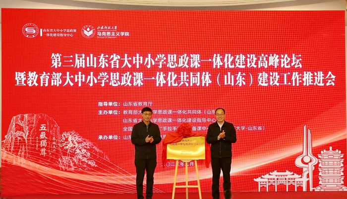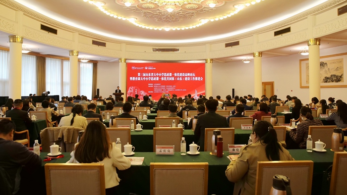 5月5日,由教育部大中小学思政课一体化共同体(山东)、山东省大中小学思政课一体化建设指导中心、全国高校思政课“手拉手”集体备课中心(山东师范大学-山东省)主办,山东师范大学马克思主义学院承办的“第三届山东省大中小学思政课一体化建设高峰论坛暨教育部大中小学思政课一体化共同体(山东)建设工作推进会”在济南举行。来自山东师范大学、山东财经大学、齐鲁师范学院、济南市教育局、济南市教科院、山东师范大学附属中学、济南德润高中、济南燕山学校、山东师范大学附属小学、济南历下实验小学等教育部大中小学思政课一体化共同体成员单位的领导专家,以及省内高校部分马院负责人和各地市基础教育领域的专家学者,共150余人参加会议。