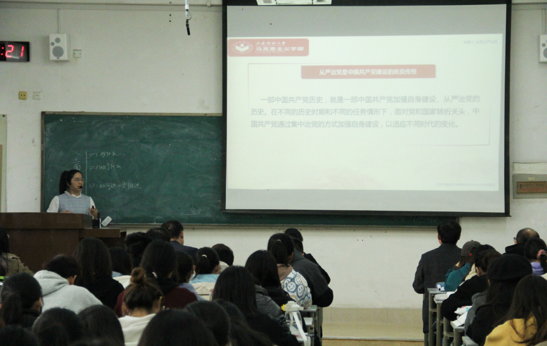 本次公开课由学部新进青年教师王红珠主讲,授课内容为公共必修课《习近平新时代中国特色社会主义思想概论》,活动分为课堂展示和课后研讨两个环节。课堂教学以十八大以来党全面从严治党取得成效的视频作为导入,引出为什么要全面从严治党的课程主题,进而详细讲解了全面从严治党的重大举措与显著成效,阐释了以党的自我革命引领伟大社会革命的理论逻辑。讲授脉络清晰,案例贴切,加深了学生对全面从严治党必要性与重要性的理解,增强了对中国特色社会主义的道路自信、理论自信、制度自信、文化自信。