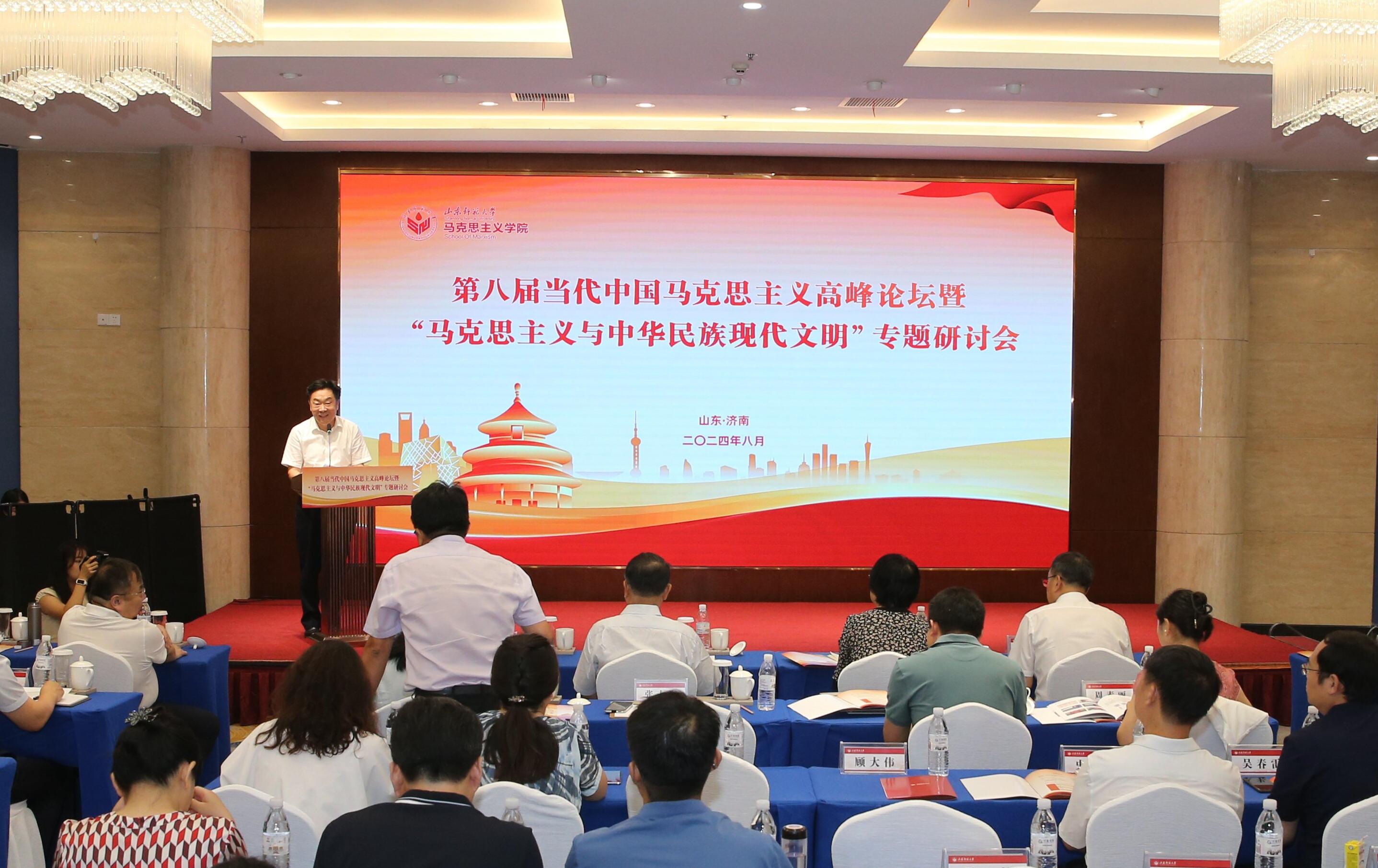 8月22日,第八届当代中国马克思主义高峰论坛暨“马克思主义与中华民族现代文明”学术研讨会在济南举办。来自中共中央党校(国家行政学院)、北京大学、清华大学、中国人民大学、吉林大学、中山大学、兰州大学、天津大学、湘潭大学、南京师范大学、山东大学、中国石油大学(华东)等高校、党校和科研机构的110余位专家学者参加论坛。山东师范大学党委书记冯继康、山东师范大学原党委书记、山东省高校当代中国马克思主义研究院院长商志晓出席开幕式并致辞。山东师范大学党委副书记万光侠主持开幕式。