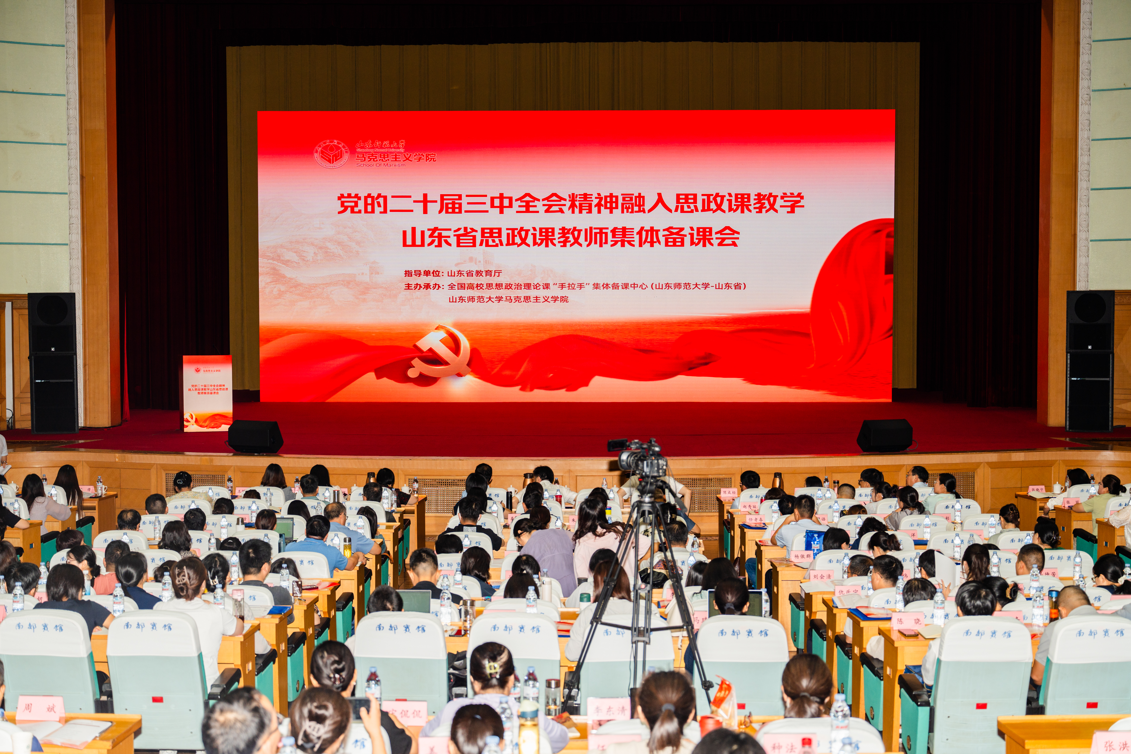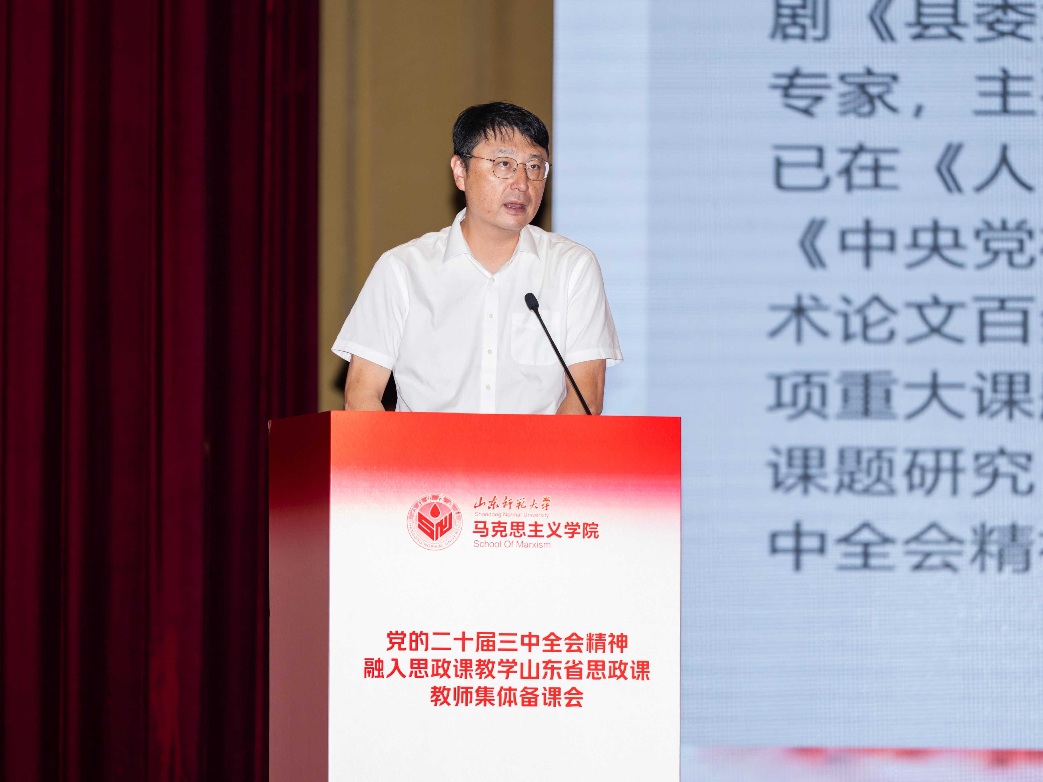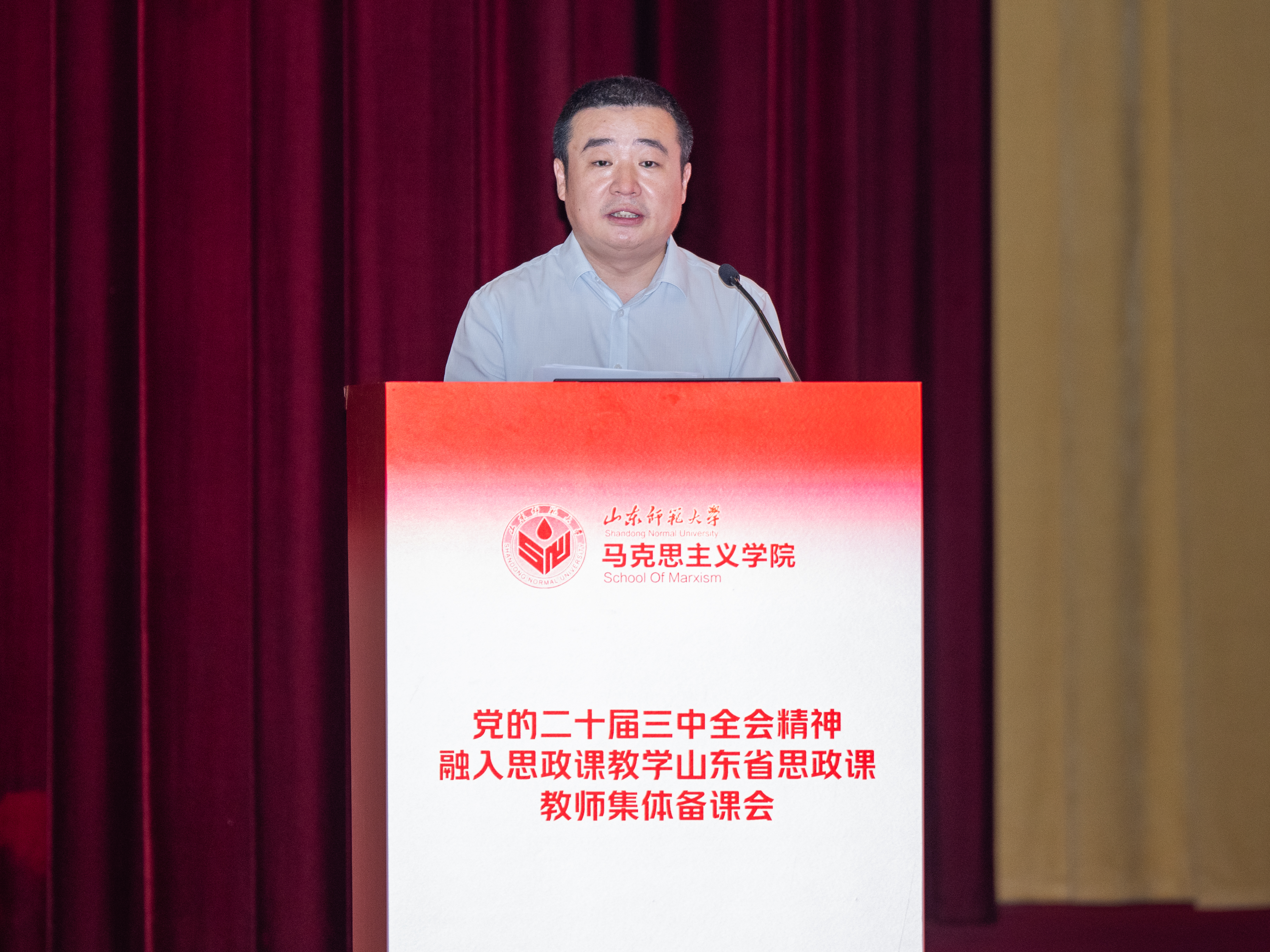 为进一步贯彻落实习近平总书记关于思政课建设的重要指示精神,坚持用党的创新理论推动思政课建设高质量发展,深入推动党的二十届三中全会精神融入思政课,8月25日上午,在山东省教育厅指导下,由全国高校思政课“手拉手”集体备课中心(山东师范大学-山东省)、教育部大中小学思政课一体化共同体(山东)主办,山东师范大学马克思主义学院承办党的二十届三中全会精神融入思政课集体备课会在山东济南举行。山东省教育厅总督学王志刚、思政处处长陈成标、山东师范大学党委副书记万光侠出席备课会,全省各地市240余位大中小学思政课教师线下参会,约19万人次通过“全国高校思想政治理论课教师网络集体备课平台”与“微赞平台”线上收看。