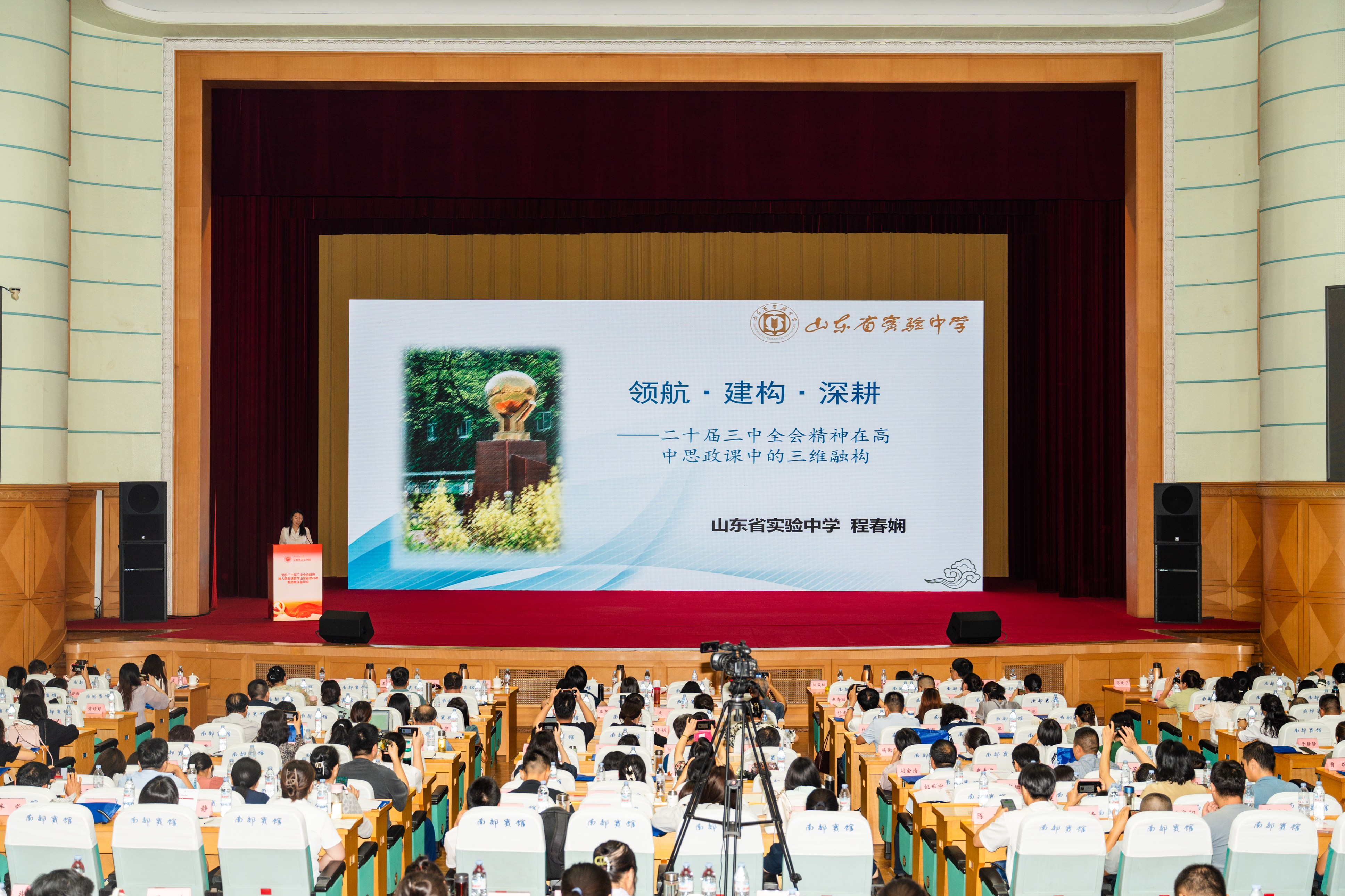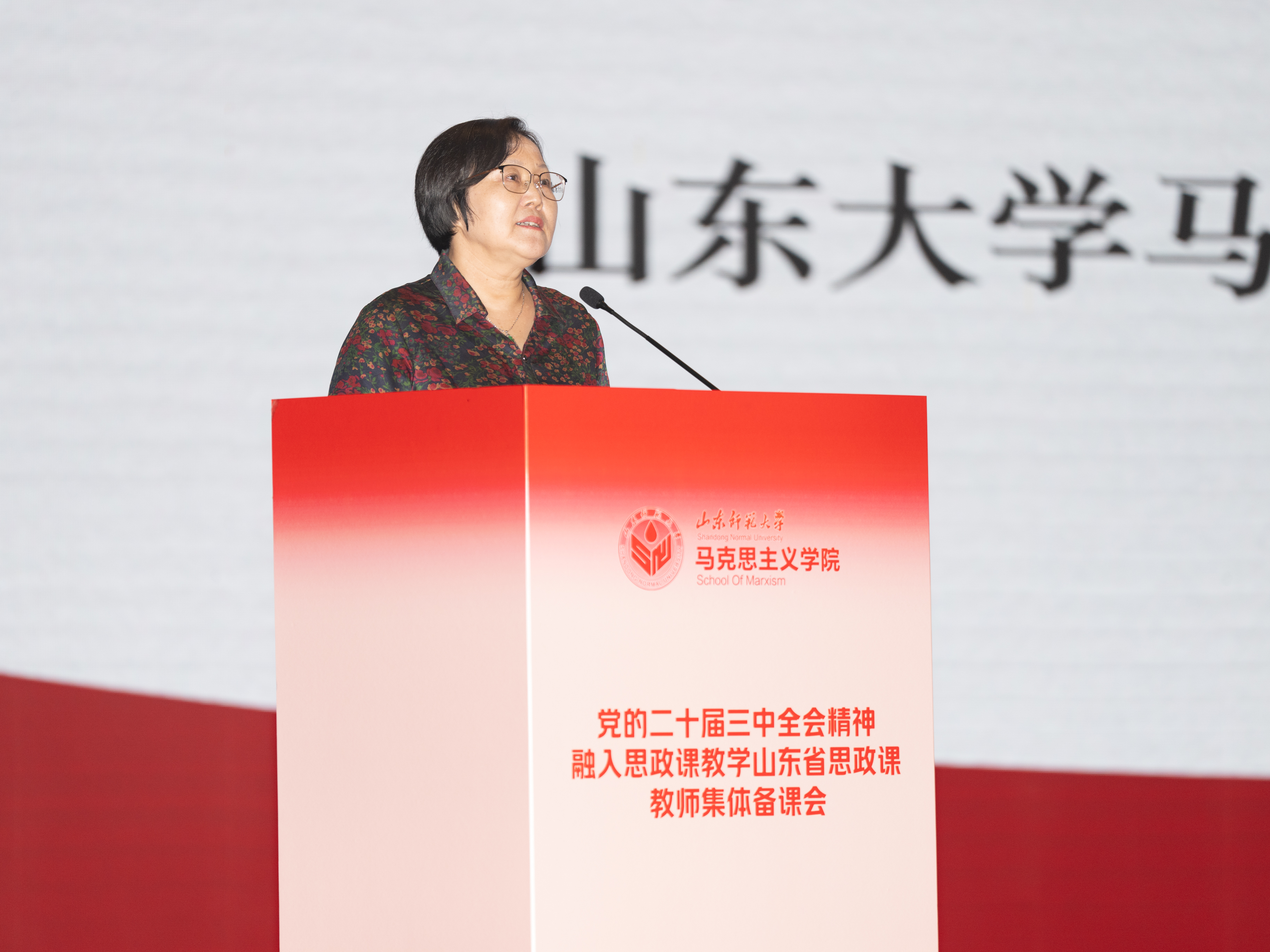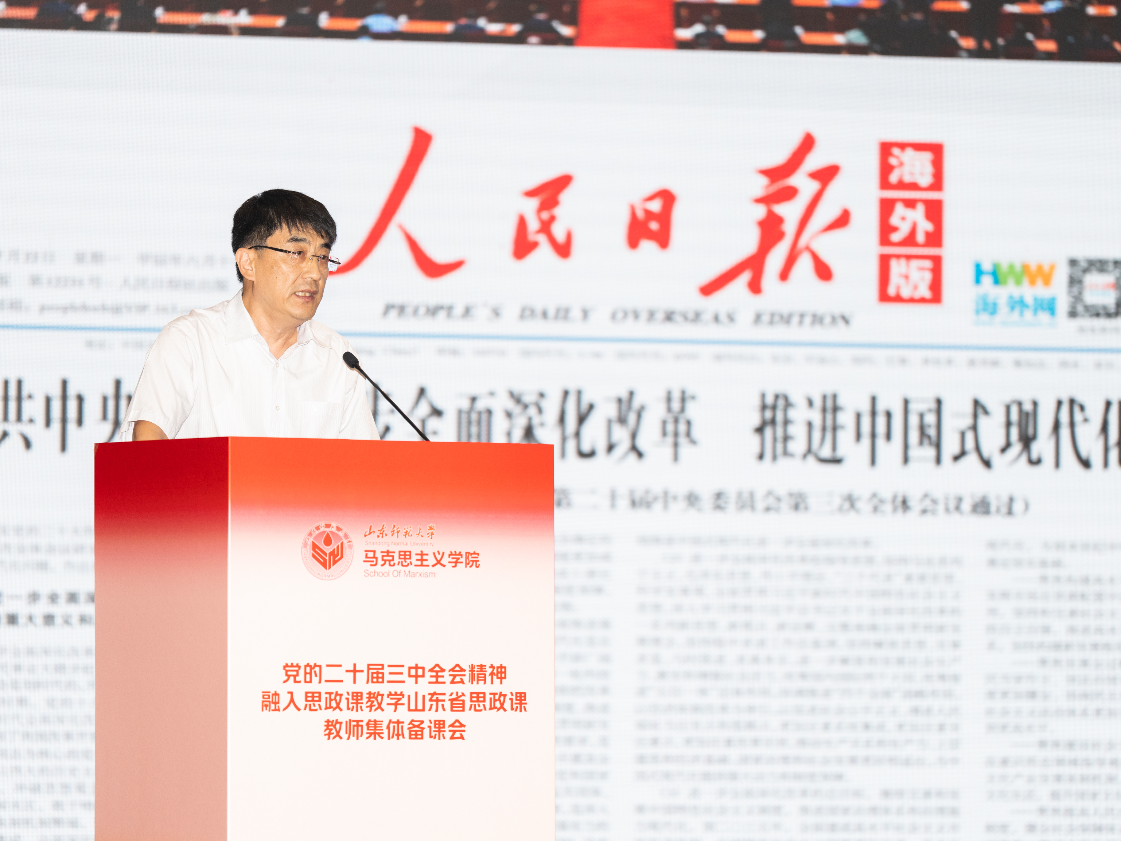 为进一步贯彻落实习近平总书记关于思政课建设的重要指示精神,坚持用党的创新理论推动思政课建设高质量发展,深入推动党的二十届三中全会精神融入思政课,8月25日上午,在山东省教育厅指导下,由全国高校思政课“手拉手”集体备课中心(山东师范大学-山东省)、教育部大中小学思政课一体化共同体(山东)主办,山东师范大学马克思主义学院承办党的二十届三中全会精神融入思政课集体备课会在山东济南举行。山东省教育厅总督学王志刚、思政处处长陈成标、山东师范大学党委副书记万光侠出席备课会,全省各地市240余位大中小学思政课教师线下参会,约19万人次通过“全国高校思想政治理论课教师网络集体备课平台”与“微赞平台”线上收看。