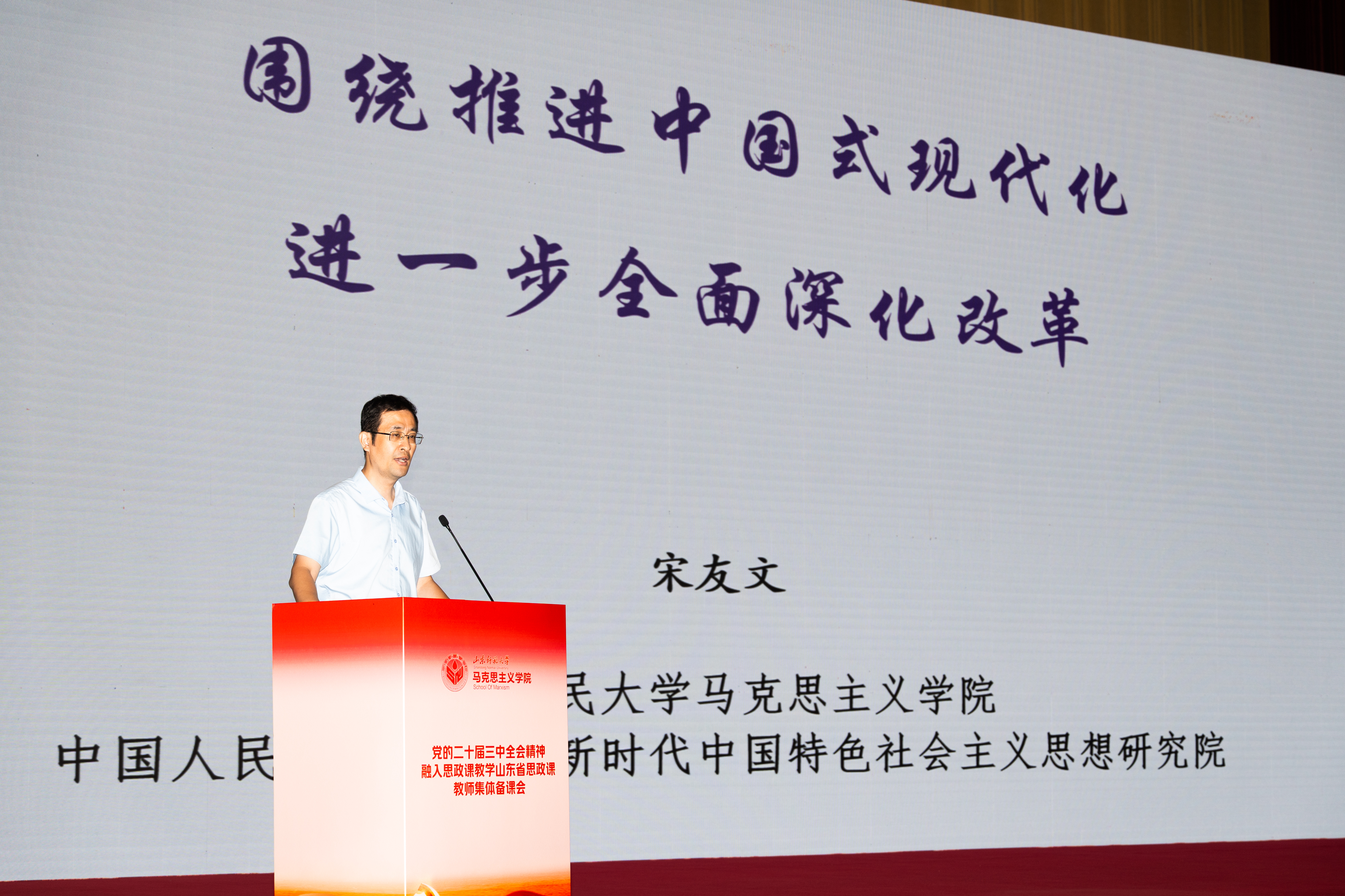 专家辅导阶段邀请了中央党校(国家行政学院)战略哲学教研室副主任郝栋教授和中国人民大学马克思主义学院副院长宋友文教授作备课辅导。郝栋教授深入阐释了党的二十届三中全会的重大意义和深远影响,重点解读了中国式现代化的鲜明特征和本质要求。宋友文教授深入浅出地解读了以全面深化改革推进中国式现代化的历史进程、内在逻辑以及其中所蕴含的中国智慧、所贡献的中国方案。两位专家的报告对于思政课教师更加系统、全面、准确地把握全会精神,更好把全会精神融入思政课教学具有重要启发和指导意义。专家辅导环节由山东师范大学马克思主义学院副院长吴春雷主持。
