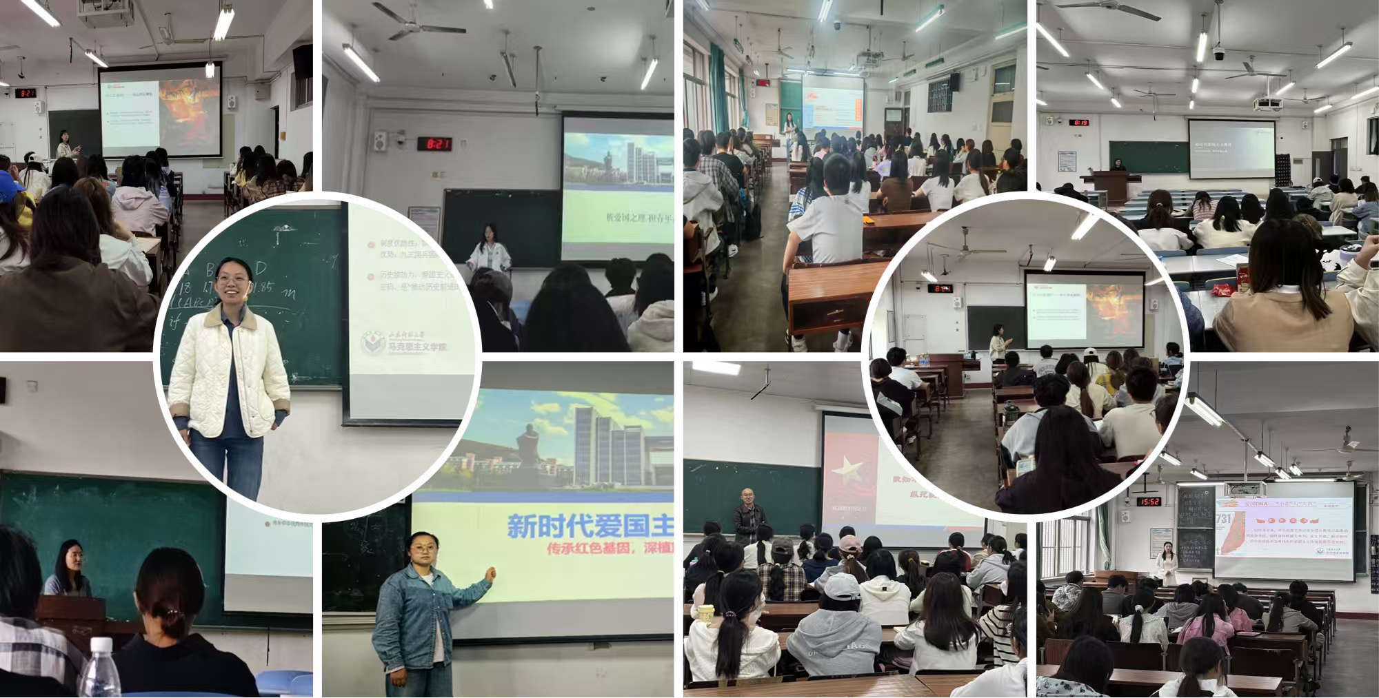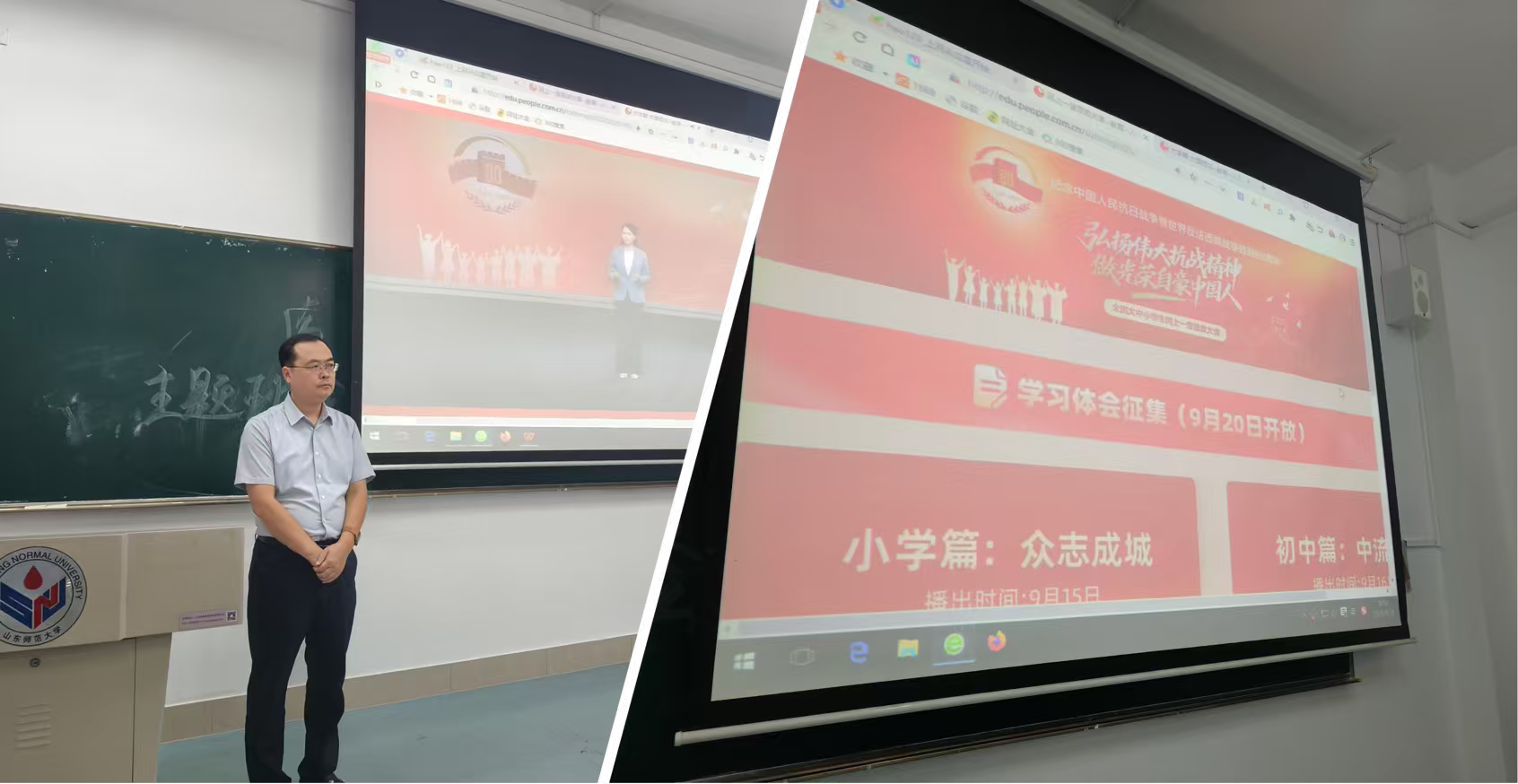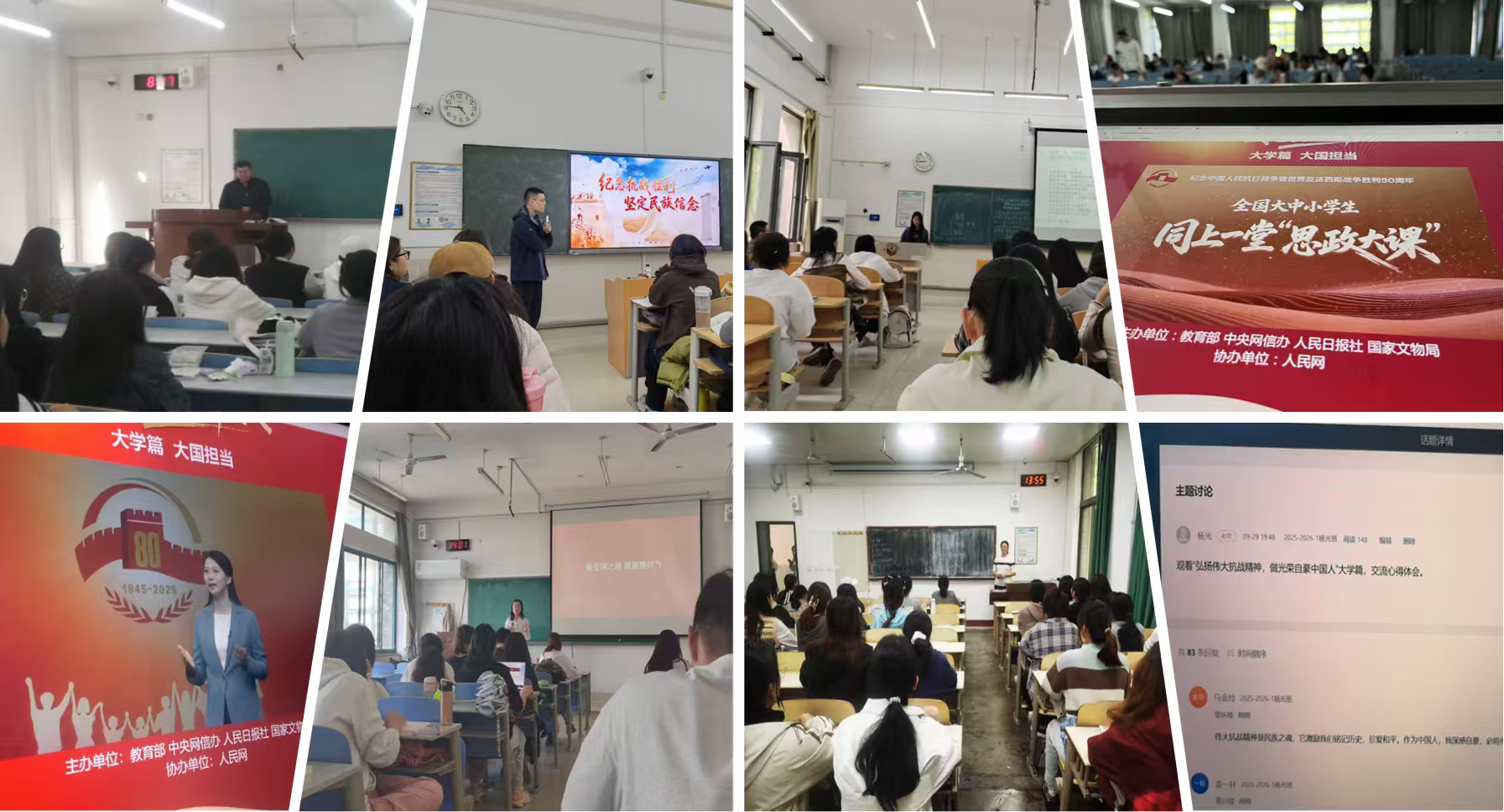 为纪念中国人民抗日战争暨世界反法西斯战争胜利80周年,贯彻落实中共山东省委宣传部、山东省教育厅关于《大中小学爱国和国防教育共同思政课工作方案》等文件精神,山东师范大学马克思主义学院开展爱国主义主题教育融入学校思政课系列活动。9月15日至10月24日,马克思主义学院组织了全体思政课教师同上爱国主义思政大课。结合观看人民网“弘扬伟大抗战精神,做光荣自豪中国人”线上思政课,学院教师将山东地方史、党史、军史、沂蒙精神、支前史等红色爱国主义元素融入各自所讲思政课程,引导学生铭记历史、缅怀先烈、弘扬爱国主义精神,知史爱国、知史爱党,坚定马克思主义与共产主义理想信念。