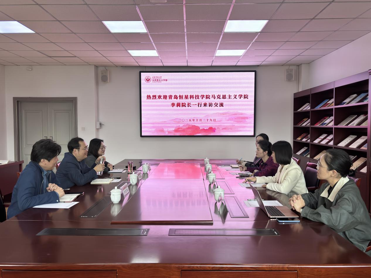 吴春雷代表学部对青岛恒星科技学院马克思主义学院同仁的到来表示热烈的欢迎和诚挚的问候。双方重点就思政课教学改革、思政课一体化建设、学科平台建设、师资队伍建设、马院合作共建等问题进行了深入探讨与交流。