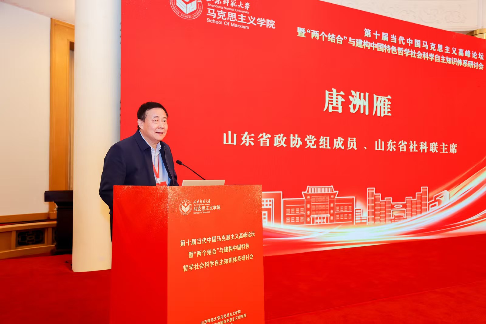 在开幕式环节,山东师范大学党委书记冯继康,山东师范大学原党委书记、山东省高校当代中国马克思主义研究院院长商志晓作致辞,山东省教育厅总督学王志刚,山东省政协党组成员、山东省社科联主席唐洲雁讲话。