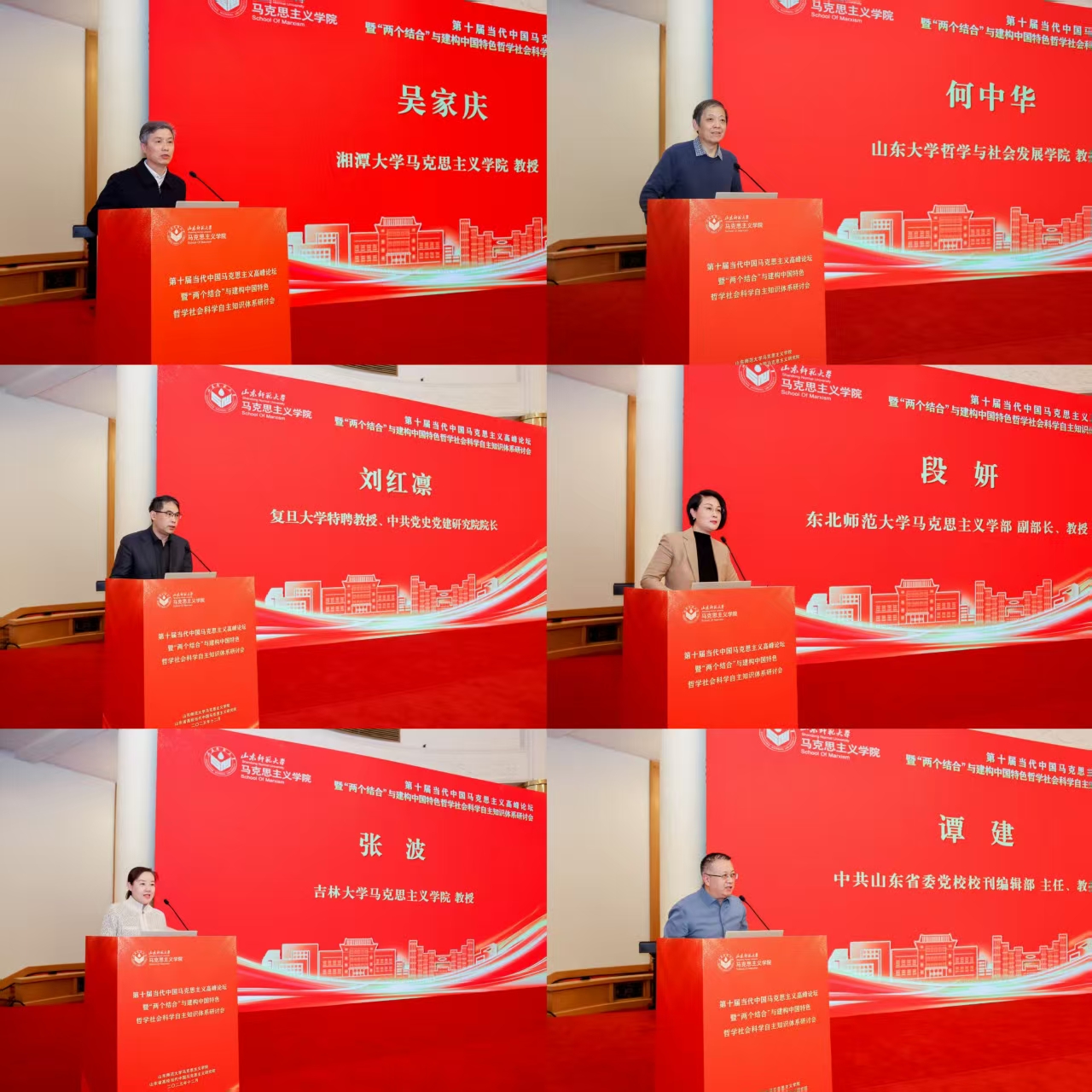 在大会主旨报告的第二阶段,湘潭大学马克思主义学院教授吴家庆、山东大学哲学与社会发展学院教授何中华、复旦大学马克思主义学院教授刘红凛、东北师范大学马克思主义学部副部长段妍、吉林大学马克思主义学院教授张波、中共山东省委党校校刊编辑部主任谭建分别以“党的全面领导是‘两个结合’的理论创造”“为何建构马克思主义哲学的中国叙事”“‘两个结合’的能动主体与实现机制”“以‘两个结合’为基础推进党的创新理论学理化体系化研究”“中国式现代化对中华文化主体性的巩固与彰显”“构建中国特色哲学社会科学自主知识体系的难题、特征与路径”为题做主旨报告。山东社会科学杂志社社长刘要停主持第二阶段主旨报告。