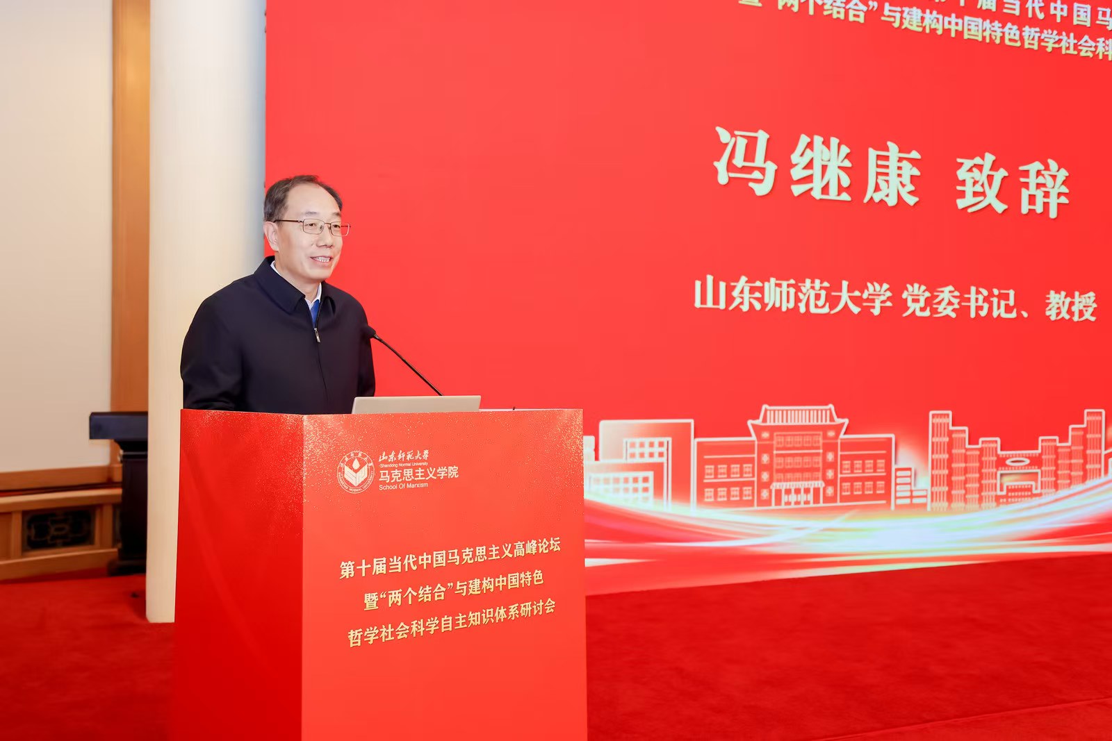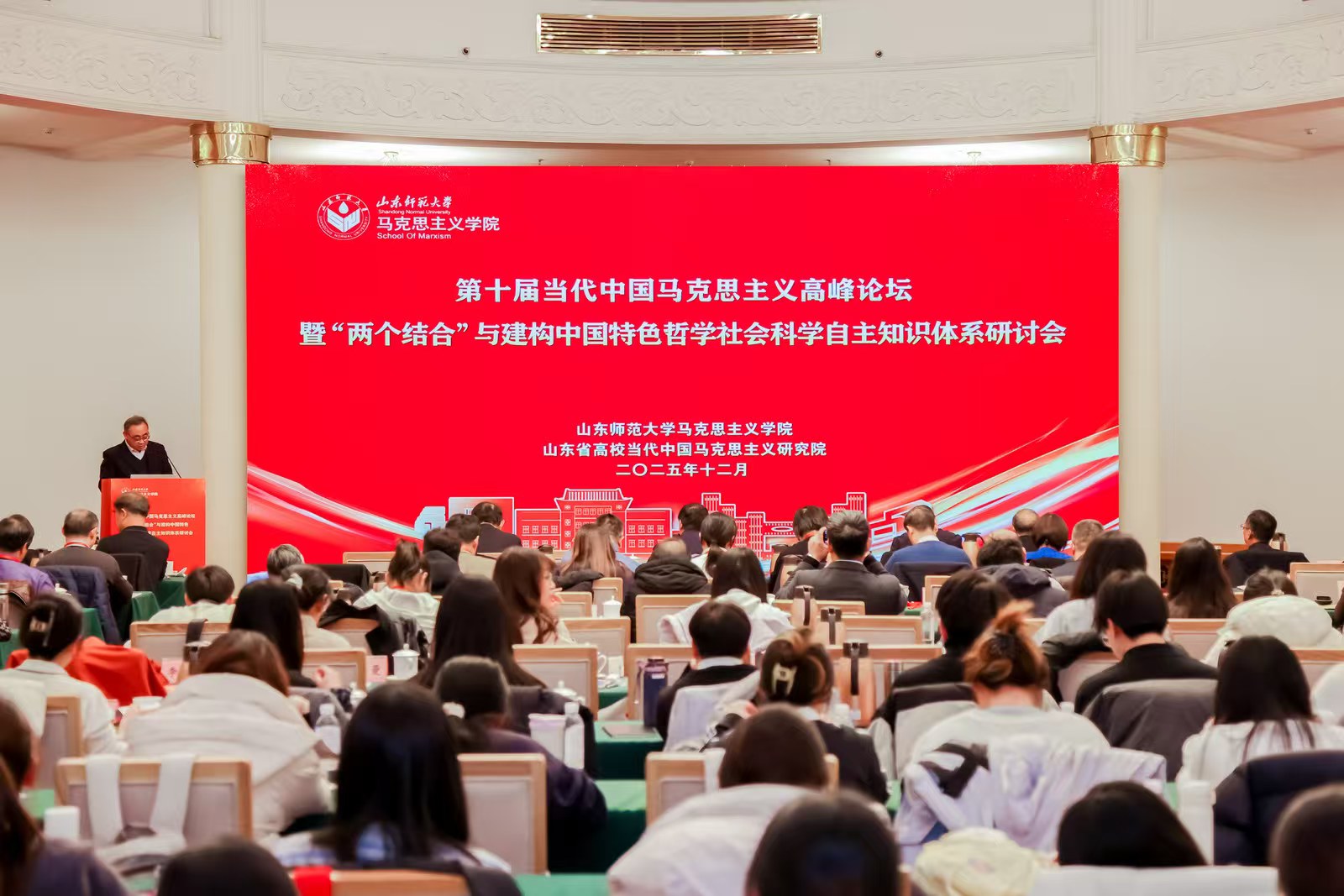 2025年12月14日,第十届当代中国马克思主义高峰论坛暨“两个结合”与建构中国特色哲学社会科学自主知识体系研讨会在济南召开。来自北京大学、清华大学、中国人民大学、复旦大学、吉林大学、山东大学、北京师范大学、西安交通大学、东北师范大学、南京师范大学、湘潭大学、浙江大学、大连理工大学、中国石油大学(华东)、山东师范大学等80多所高校、社科院、党校的专家学者及学生,共计200多人参加会议。研讨会由山东师范大学马克思主义学院和山东省高校当代中国马克思主义研究院主办。