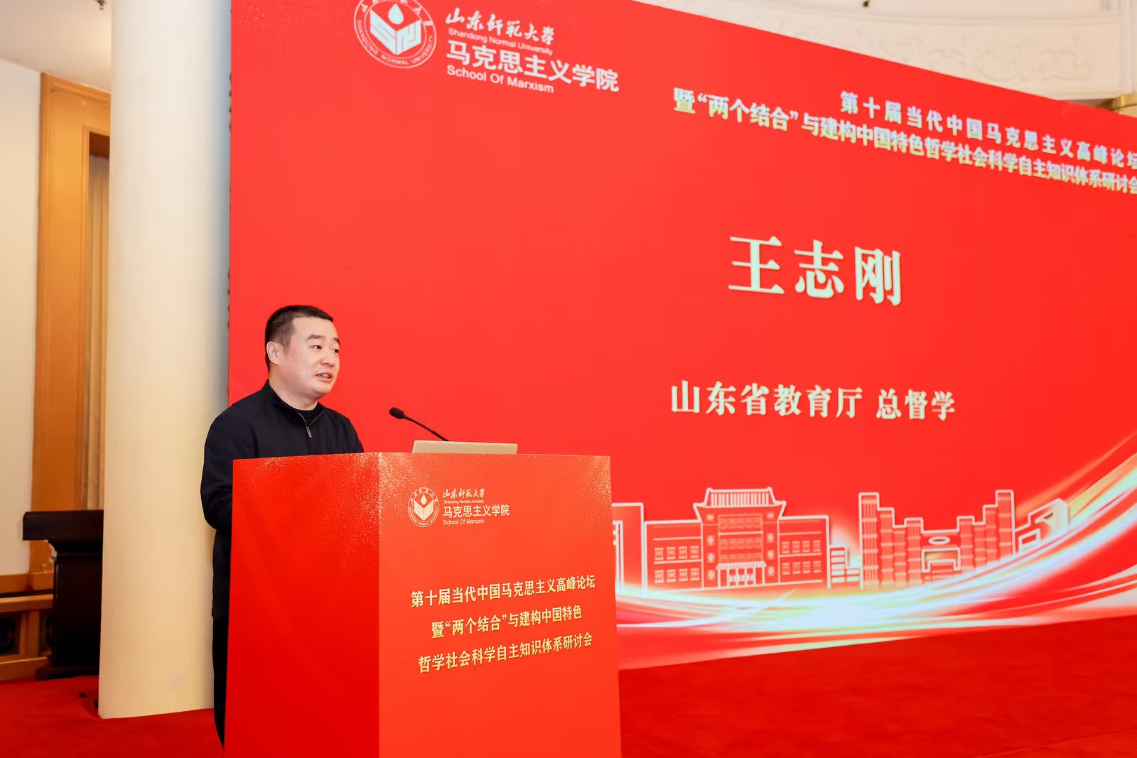 王志刚在讲话中指出,构建中国特色哲学社会科学自主知识体系,需要系统总结中国实践经验。山东作为文化大省和中华文明的重要发源地,不仅为“第二个结合”提供了重要资源,同时也是“第一个结合”的重要场域,通过阐清“两个结合”与建构中国特色哲学社会科学自主知识体系的内在逻辑关系,必将推动高校哲学社会科学发展、科学研究、人才培养工作,为教育强省建设做出新的贡献。唐洲雁在讲话中着重阐明了如何建构中国特色哲学社会科学自主知识体系的问题,认为建构中国特色哲学社会科学自主知识体系要以“两个结合”为根本方法、历史视角和现实关照,才能有力回答中国式现代化的重大理论和实践问题,才能展现出中国特色、中国气派、中国风格,才能为人类文明发展贡献中国智慧和中国力量。开幕式由山东师范大学马克思主义学院院长王增福主持。