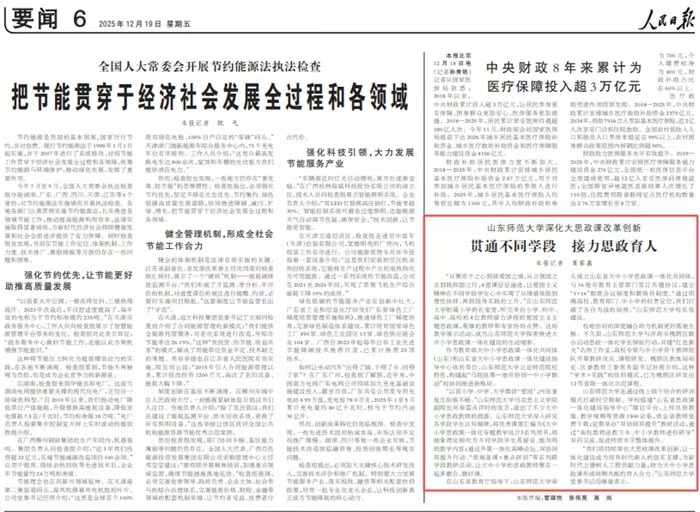 【编者按】12月19日,《人民日报》6版要闻以《山东师范大学深化大思政课改革创新——贯通不同学段 接力思政育人》为题,报道山东师范大学立足师范院校特色,构建起“马院统筹—地市协同—中小学联动”的协同推进新格局,全文如下: