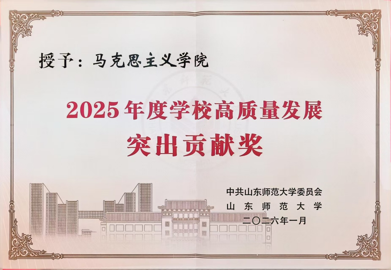 2月1日,山东师范大学2025年高质量发展总结表彰大会在千佛山校区大礼堂举行。在校学校领导出席会议。校党委书记冯继康代表学校总结2025年工作,校长张建主持大会。大会对过去一年在学校各项工作中表现突出的集体予以表彰,马克思主义学院获评“高质量发展突出贡献奖”与“校园安全文明奖”。