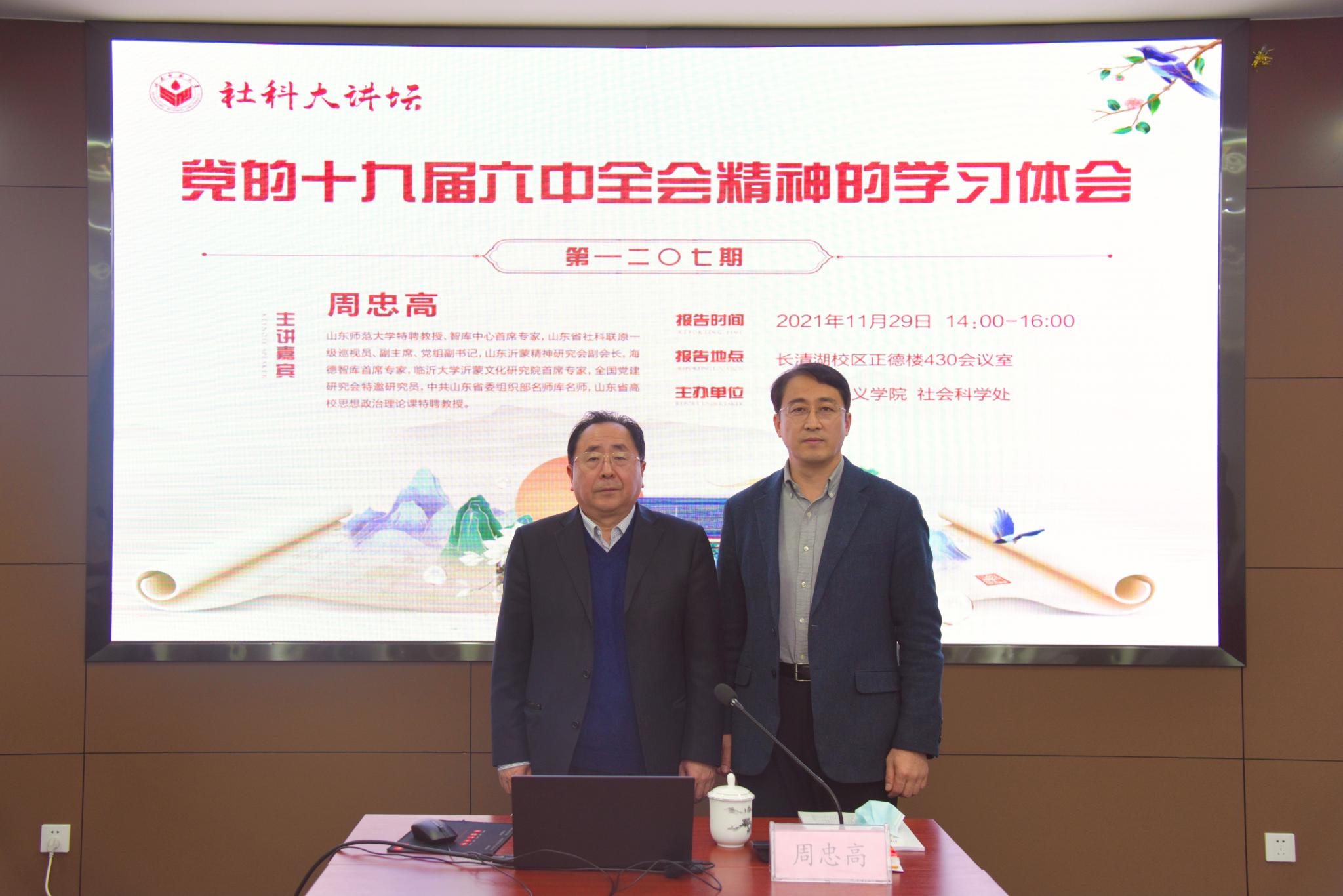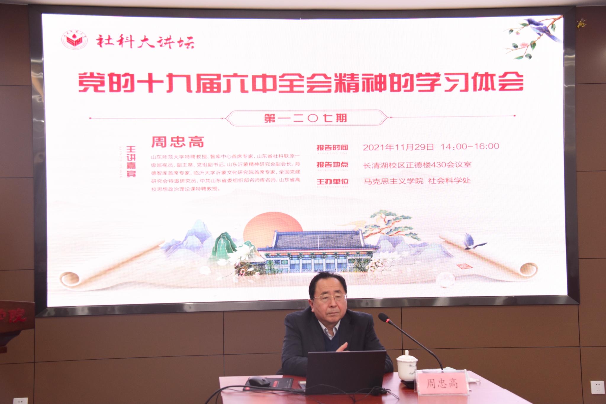 11月29日下午,由马克思主义学院与社会科学处联合举办的社科大讲坛在长清湖校区正德楼430学术会议室开讲。本次大讲坛特邀山东省社科联原一级巡视员、副主席、党组副书记周忠高担任报告会主讲人,作题为“党的十九届六中全会精神的学习体会”的学术报告。报告会由马克思主义学院党委书记吕晓勇主持。学院硕博共50余人参加了此次报告会。