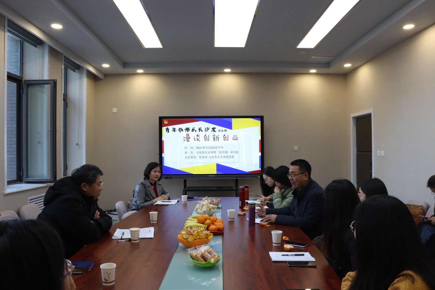 11月25日下午,由校团委和马克思主义学院团委主办的“青年教师成长沙龙”系列活动之“漫谈创新创业”座谈会于长清湖校区正德楼413会议室举行。报告会由学院学工办主任、团委书记潘磊主持,学院20余名青年教师参与其中。
