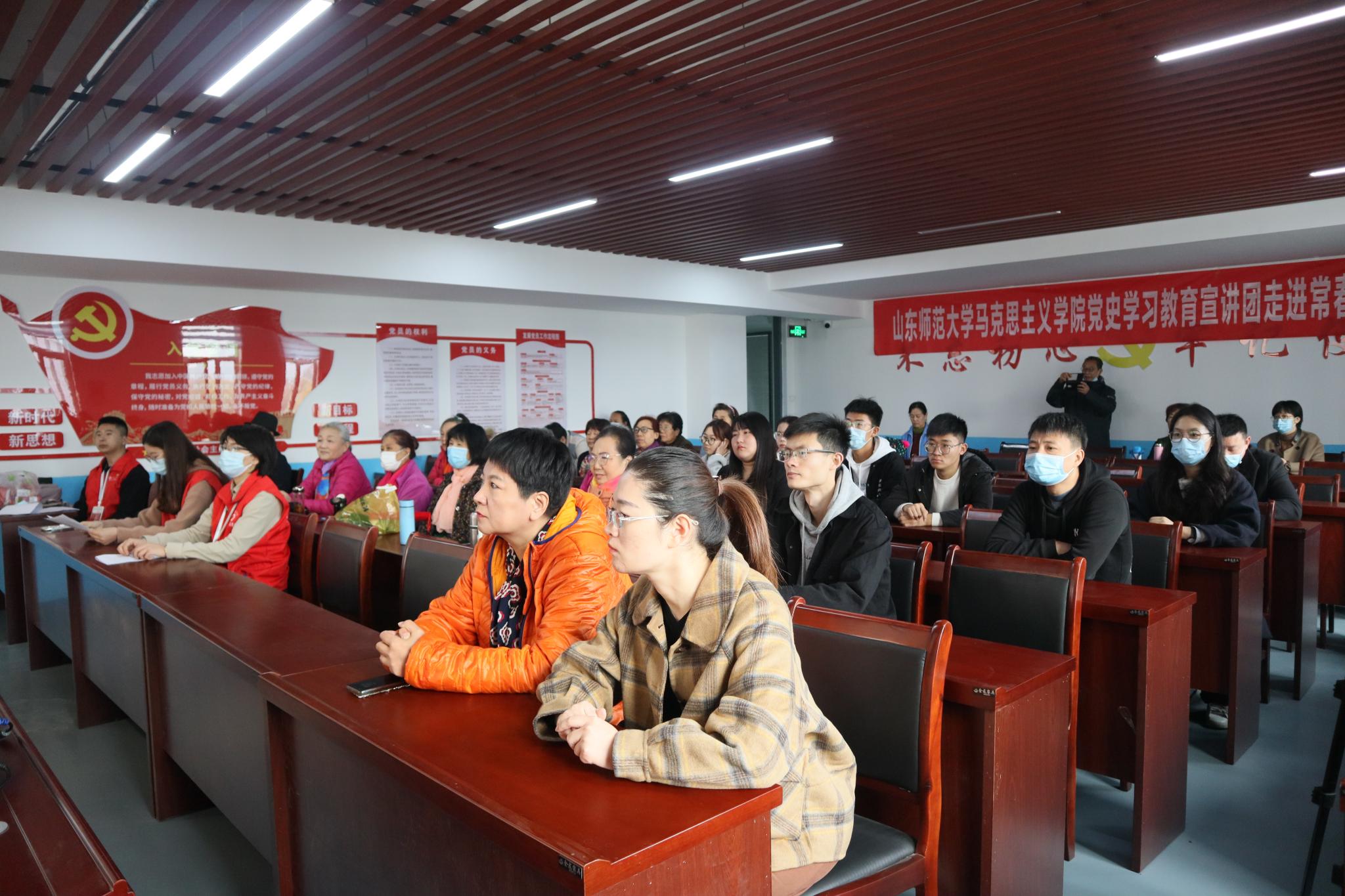 10月26日上午,马克思主义学院党史学习教育宣讲团于长清区崮云湖街道常春藤北社区开展“学习百年党史 凝聚奋进力量”基层党史宣讲。学院教师曹瑞及四名宣讲团成员结合百年党史基本经验展开了一场通俗易懂、振奋人心的基层党史宣讲。社区全体两委成员、党员代表、居民代表40余人踊跃参与其中。