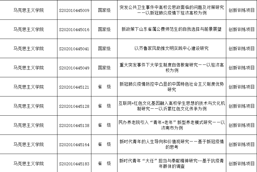 据悉,学院创新创业训练计划项目主题彰显学院特色,涉及思政课建设、养老模式、医患关系与制度自信等多个方面,展现出学院学子逐梦青春,勇于担当的情怀。其中,新政策下山东省属公费师范生的自我选择与前景展望、以齐鲁家风助推文明实践中心建设研究以及燎原星火—农村扶贫扶智公益平台等项目,以创意的构思斩获国家级立项。民办养老院引入“青年+老年”新型养老模式研究—以济南市为例、新冠肺炎疫情防控中凸显的中国特色社会主义制度优势研究等项目荣获省级立项。除此之外,和谐医患关系的思想政治教育对策研究、置物app等项目获得校级立项。
