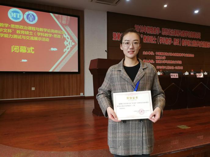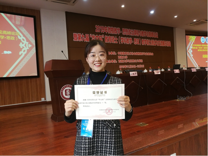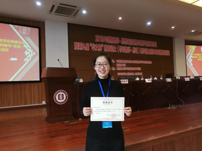 11月29日至12月2日,由中国教育技术协会微格教学专业委员会主办的2019年微格教学·思想政治课程与教学论高峰论坛暨第九届“华文杯”教育硕士(学科教学·思政)教学能力测试与交流展示活动在西南大学举办。在学位点负责人王兰芳老师和李寒梅老师带领下,我院学科教学(思政)专业硕士研究生刘琦、张明雪、温立燕参加了此次活动并取得了优异成绩。其中,刘琦、张明雪获得教学技能评比一等奖,温立燕获得教学技能评比三等奖;刘琦获得教学设计评比一等奖,张明雪、温立燕获得教学设计评比二等奖。王兰芳、李寒梅、史家亮老师获得指导荣誉证书。