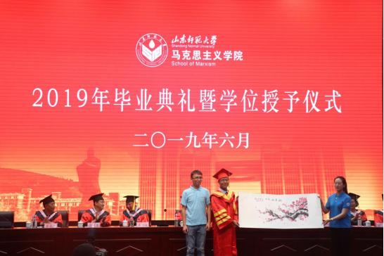 在庄严的国歌声中,毕业典礼拉开序幕。研究生工作部部长李效宽与学生工作处处长李鹏健宣读《马克思主义学院2019届优秀毕业研究生名单》和《马克思主义学院2019届优秀本科毕业生名单》,研究生院院长张宗斌与教务处副处长贾斐宣读《关于授予马克思主义学院孙爽等96人博士、硕士学位的决定》和《关于授予马克思主义学院姜志浩等294人学士学位的决定》。390名毕业生依次走上主席台,从主席台领导老师的手中接过学位证书,接受拨穗。