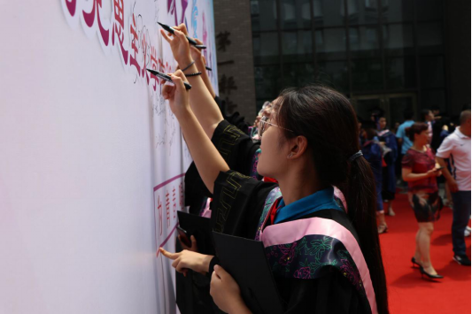 典礼开始前,老师家长们与全体毕业生踏过红毯,在“致青春 致大学 致未来”签名墙前签名拍照留念后,陆续进入会场。开场短片中的一幕幕光影匆匆流过,沙画视频与毕业MV记录着学子们珍贵的大学记忆。