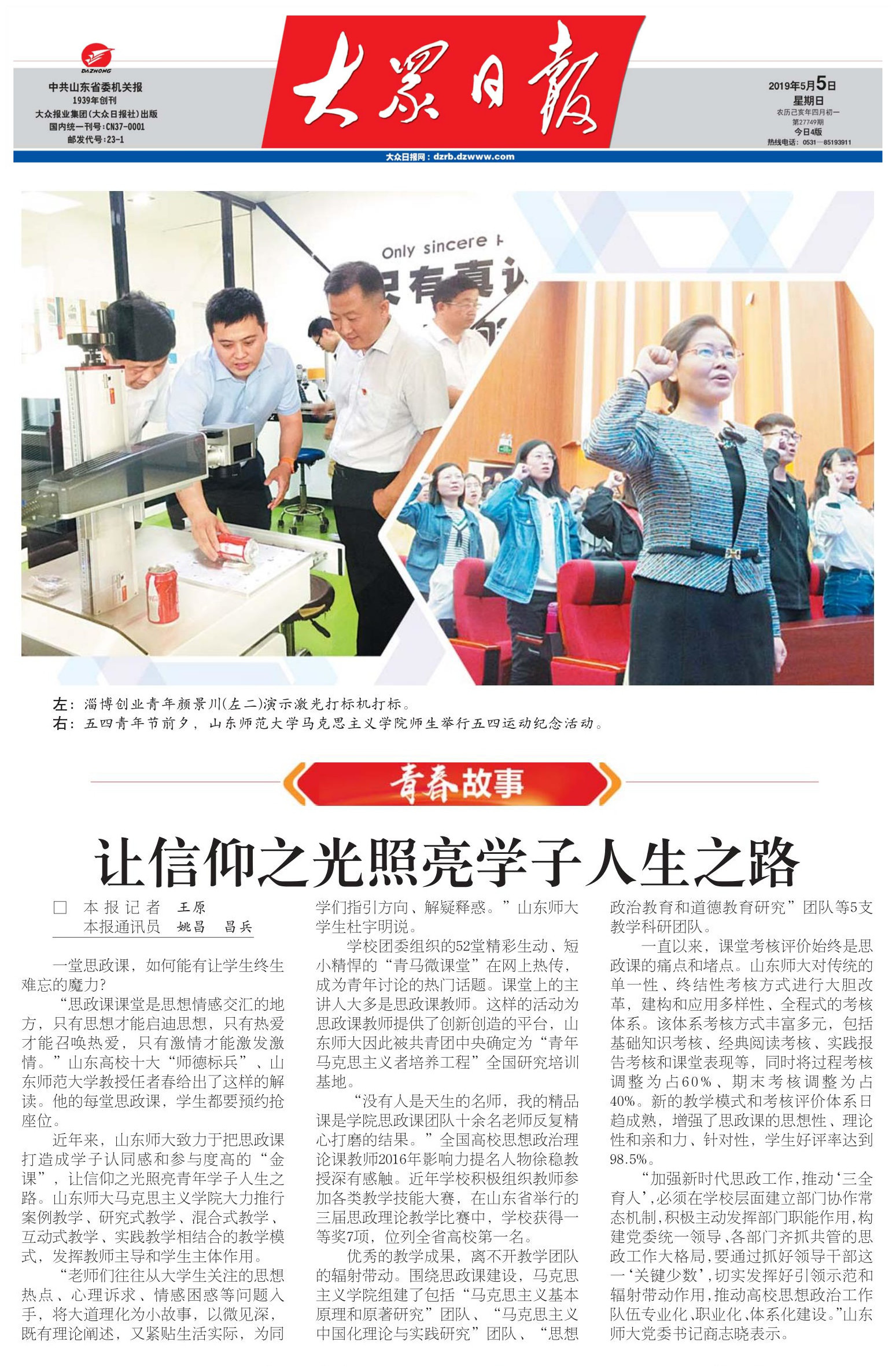 近年来,山东师大致力于把思政课打造成学子认同感和参与度高的“金课”,让信仰之光照亮青年学子人生之路。山东师大马克思主义学院大力推行案例教学、研究式教学、混合式教学、互动式教学、实践教学相结合的教学模式,发挥教师主导和学生主体作用。