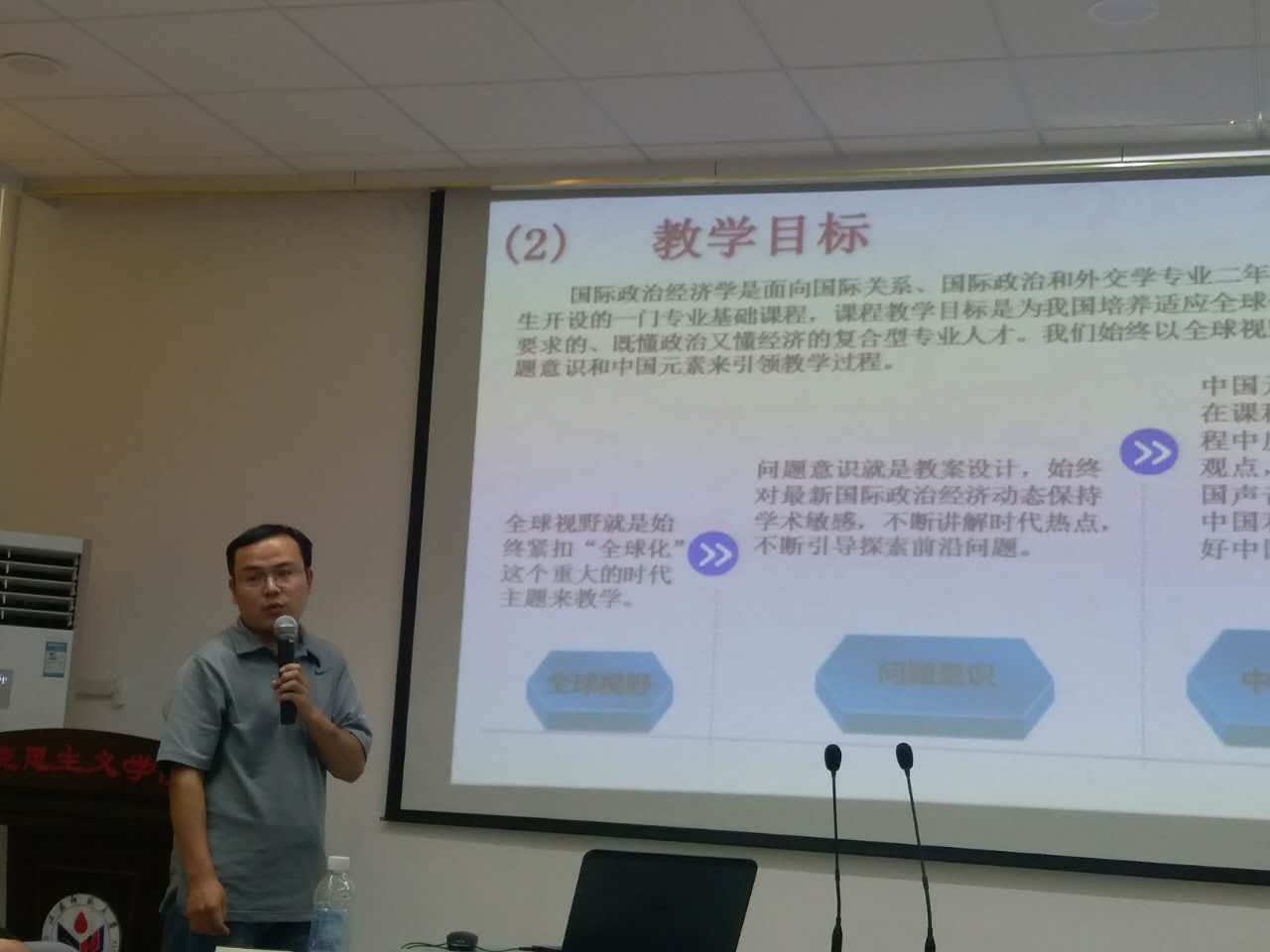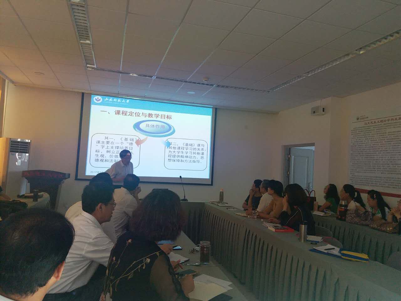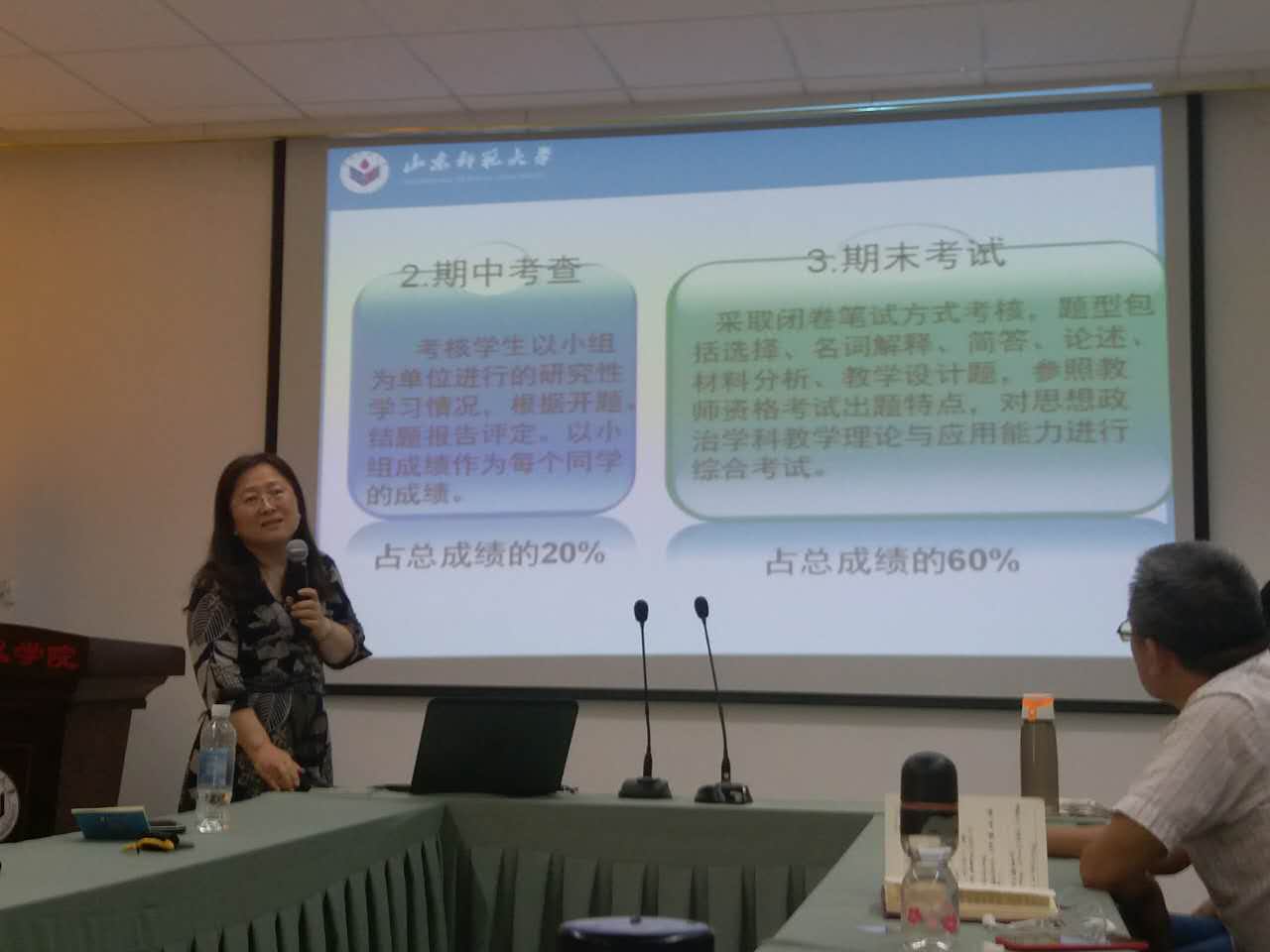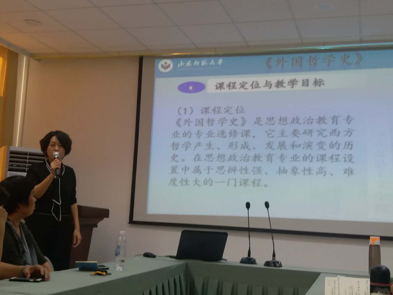 为顺利迎接教育部本科教学评估工作,9月14日下午,马克思主义学院召开全体教师会,集体观摩四位教师做教学评估课程分析。本次展示的课程及主讲教师包括任者春教授的《思想道德修养与法律基础》、王兰芳教授的《思想政治学科教学论》、王青老师的《外国哲学史》、马建英老师的《国际政治经济学》,涵盖了思政课、专业必修课、专业选修课。四位老师对课程分析都做了十分充分的准备,制作了精美的课件,在课程分析的内容上既囊括评估所要求的内容,又结合自己课程实际突出了各自的特色,通过四位老师的精彩讲解把整门课程的情况做了充分展示,也让旁听的教师学到了很多有关课程分析及教学方面的有益知识,收获颇丰。