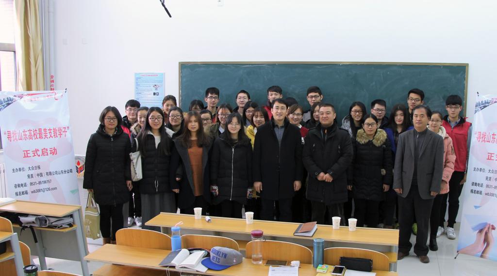 王振国在讲话中表示,本次活动由大众日报和完美(中国)有限公司山东分公司一起主办,山东省内60余所高校都将参与其中,旨在通过这个评选平台将我省优秀支教学子的精神面貌和敬业风采,展示给全省广大读者。他还讲到,山东师范大学马克思主义学院的同学近几年在大学生支教工作中作出的一系列的努力,也取得了一定的成绩,涌现出了一大批积极投身大学生支教事业的典型个人和团队,他希望同学们能够从自身做起,以此次活动的开展为契机,在省内将支教的先进方法、优秀品质进行推广,作为全省第一站做好表率。