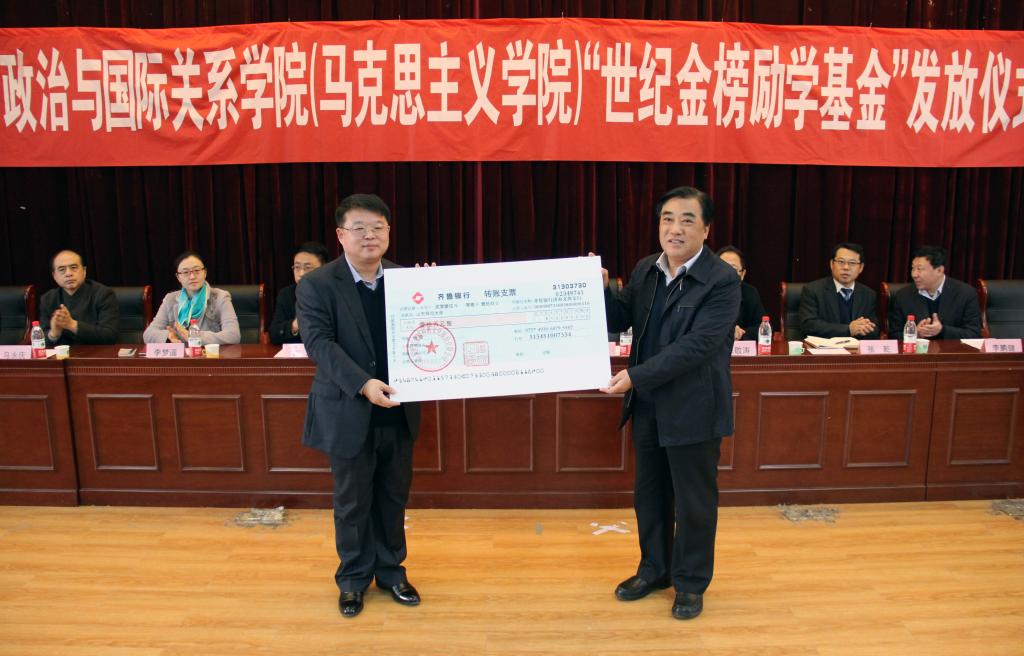 王焕斌在讲话中指出,青年大学生是民族的未来,国家的希望,健全的奖助学金政策为青年大学生的成长成才提供了保障。“世纪金榜励学基金”的发放不仅体现了世纪金榜人“贵仁、重义、遵礼、守信”的企业道德和心系教育、情系学子的高尚风范,更激励着青年大学生锐意进取、奋发有为。他希望同学们要珍惜资助、刻苦学习,立志成才,自觉在建设中国特色社会主义事业中奉献才智;要坚定信心,磨砺意志,自信自强,不断迎接人生路上的新挑战;要学会感恩,奉献社会,自觉践行社会主义核心价值观,真正承担起国家民族之责任。