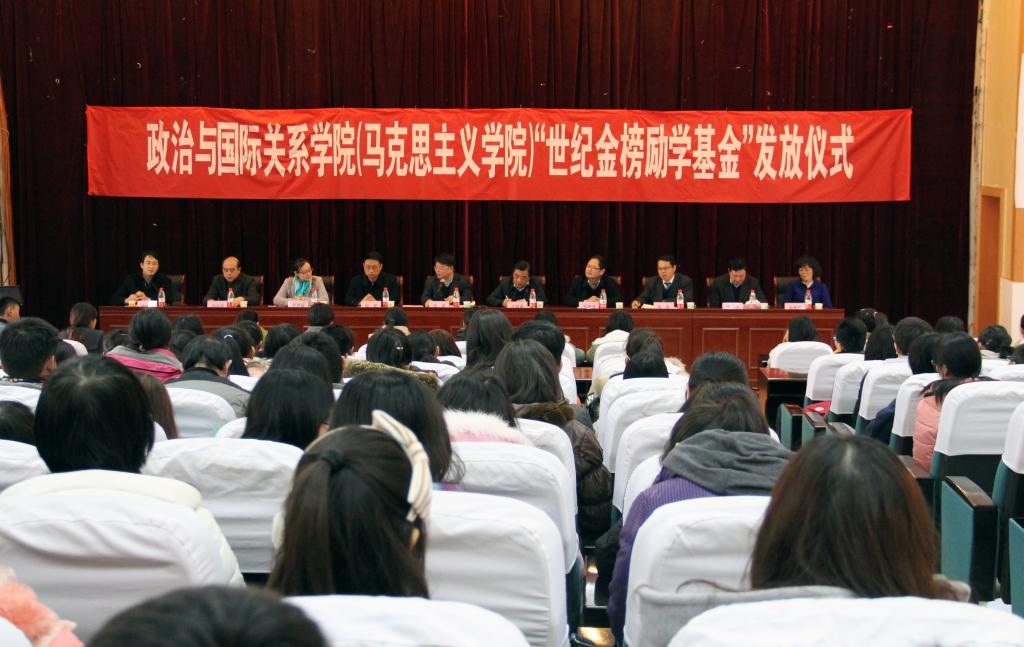 1月20日上午,政治与国际关系学院(马克思主义学院)在长清湖校区综合教学楼C区154报告厅举行“感恩·榜样·梦想”世纪金榜励学基金发放仪式。学校副校长王焕斌、世纪金榜集团董事长张泉出席仪式,长清校区办公室、学生处、团委等部门负责同志及学院师生代表共300余人参加仪式。仪式由学院党委副书记吕晓勇主持。
