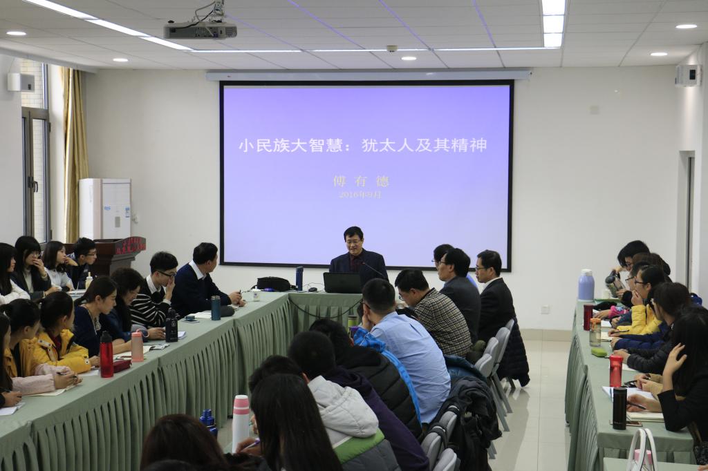 报告伊始,王增福副院长首先对傅有德教授的到来表示热烈的欢迎,并对其研究领域和研究成果作了简要的介绍。报告会中,傅有德教授首先从犹太人的故事说起,先让我们对犹太人有一个大体的了解,接着全面而系统的为我们介绍了犹太人的七种精神,即神本主义精神、律法主义精神、诚信守约精神、求异精神、自由与平等精神、尊师重教传统、坚韧不拔的意志,从而让我们对犹太民族有了更深刻的认识。在报告过程中,傅有德教授不时与在座的师生积极交流互动,生动形象的语言,条理清晰的逻辑思维,引起与会者的阵阵掌声。本次报告会拓宽了师生的研究视野,激发了我院老师学生的科研创新精神,对展开相关领域研究具有较强的指导意义。