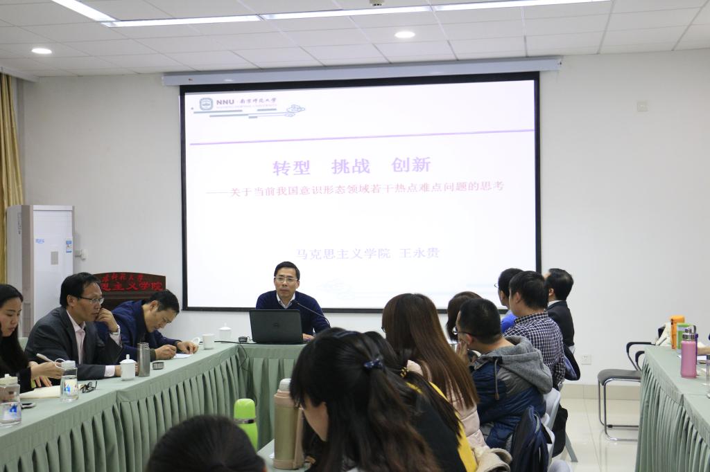 11.17日晚,应马克思主义学院邀请,南京师范大学教授、博士生导师王永贵来我院作题为《转型 挑战 创新——关于当前我国意识形态领域若干热点难点问题的思考》的学术报告。学术报告在长清湖校区学院楼430学术会议室举行,由马克思主义学院院长高继文主持,学院相关专业老师和研究生百余人聆听了此次报告会。