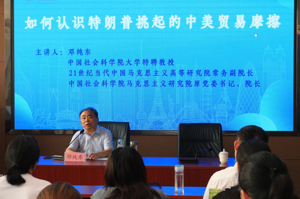 9月24日下午,由马克思主义学院与社会科学处联合举办的第838期社科大讲坛在长清湖校区正德楼430学术报告厅开讲。本次大讲坛特邀中国社会科学院马克思主义研究院原党委书记、院长邓纯东教授担任报告会主讲人,做了题为“如何认识特朗普挑起的中美贸易摩擦”的学术报告。报告会由马克思主义学院副院长史家亮主持。