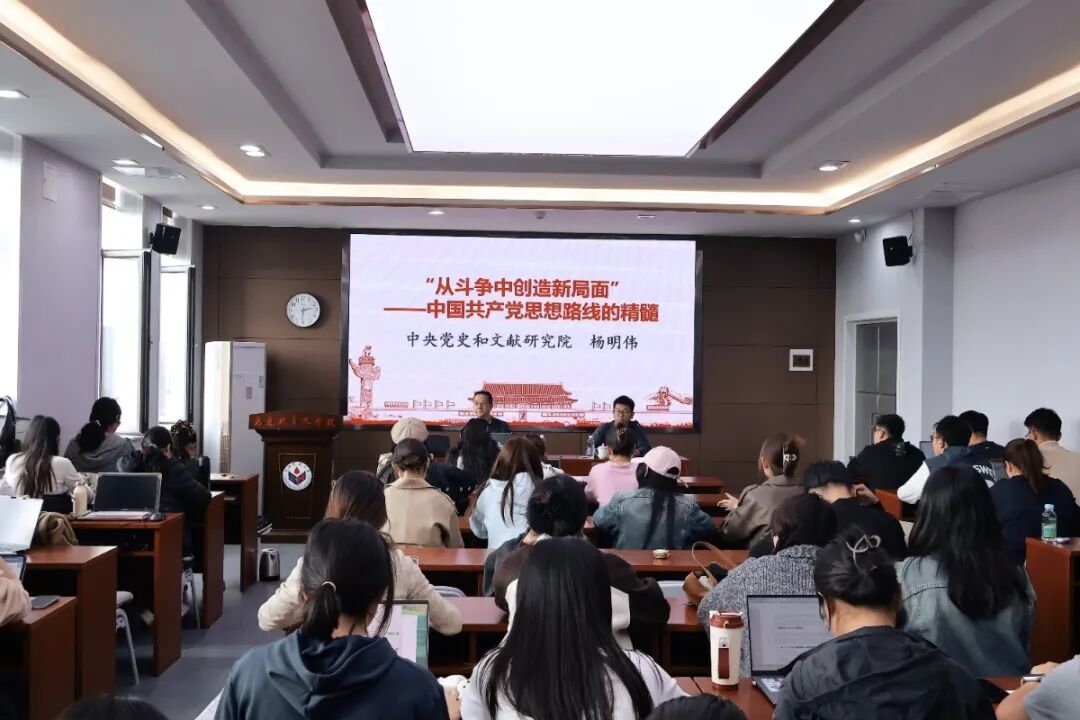 本次“学术公开课”,杨明伟老师围绕“‘从斗争中创造新局面’——中国共产党思想路线的精髓”的相关问题进行了深入剖析。整场报告内容详实、解读深入且通俗易懂,有效帮助在场师生对党的思想路线形成了更系统的认知与更深刻的把握,在学院营造了浓厚的学术氛围。