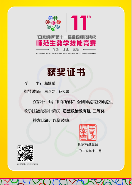 2025年11月30日,第十一届“田家炳杯”全国师范院校师范生教学技能竞赛在浙江师范大学落幕。本届比赛规模盛大,全国289所高校的2345名选手参赛。我院思想政治教育专业本科生赵婧原在王兰芳、孙天蕾老师指导下精心准备,获得三等奖的优异成绩。