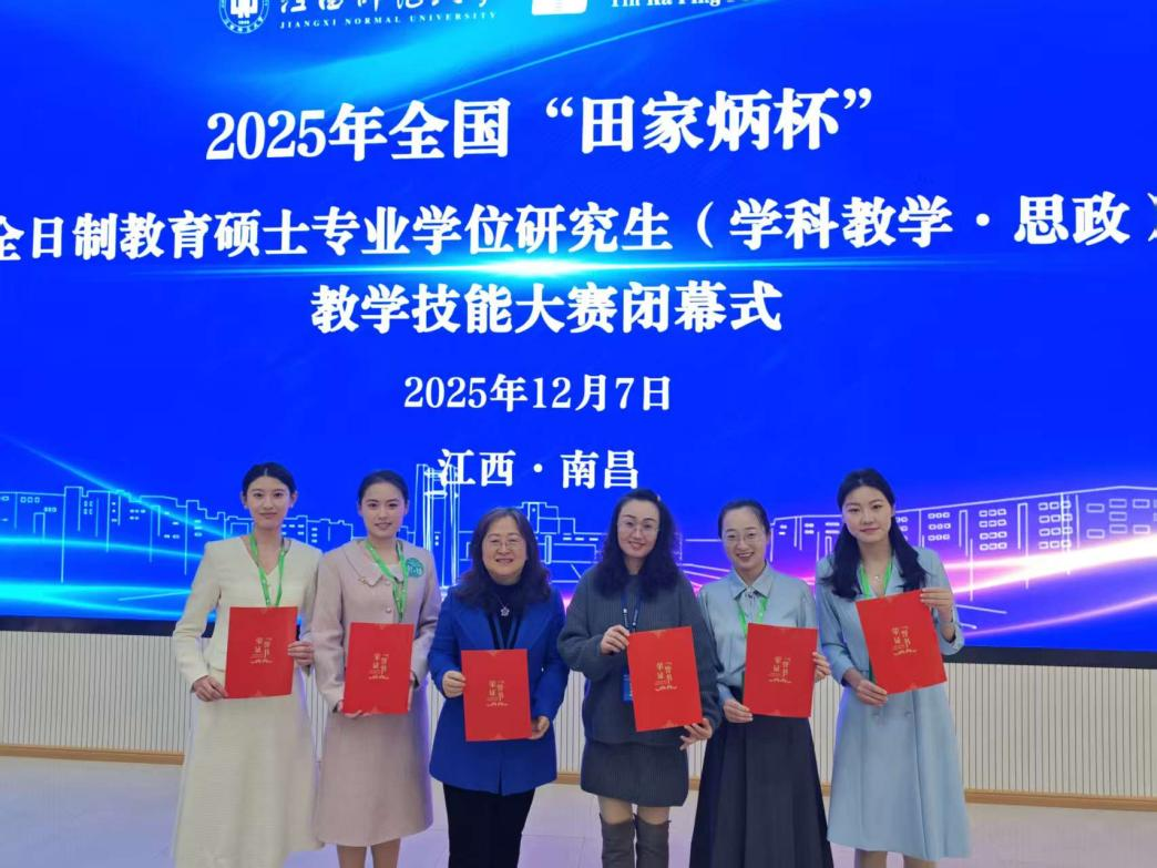 2025年12月5日至12月7日,2025年全国“田家炳杯”全日制教育硕士专业学位研究生(学科教学·思政)教学技能大赛决赛在江西师范大学成功举行,来自全国98所高校的255名教育硕士研究生同台竞技。我院选派的4名选手跻身决赛,凭借扎实功底与出色表现,再创佳绩,王雪莹同学获得一等奖、孙芊芊、王志敏同学获得二等奖,王丹娜同学获得三等奖。王兰芳教授、孙天蕾副教授获得优秀指导教师。