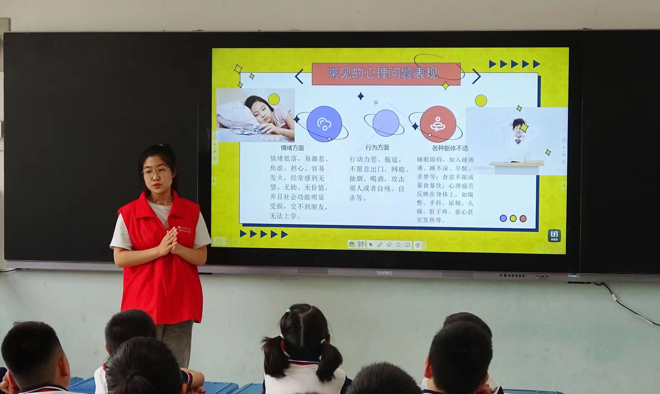 以实际行动促进心理健康,以志愿服务传递人间温暖。马克思主义学院社团与志愿服务部走进济南市长清区第三实验小学开展心理健康月宣讲和志愿服务活动。在知识宣讲中,学院志愿者结合小学生的心理特点,围绕着什么是心理健康、常见的心理问题及如何调整心理问题进行了生动地讲解,帮助孩子们解决心理问题,让孩子们树立起“爱自己、爱家庭、爱学校、爱社会”的良好观念,从而使其更加健康快乐地进行学习和生活。在志愿服务活动中,学院志愿者们用生动活泼的语言引导孩子们用纸笔画出心目中理想的动物或植物,并鼓励孩子们进行小组讨论与展示,充分展现出学院青年无私奉献、关爱儿童的良好品质和在新时代传递温暖与关怀的责任与担当。
