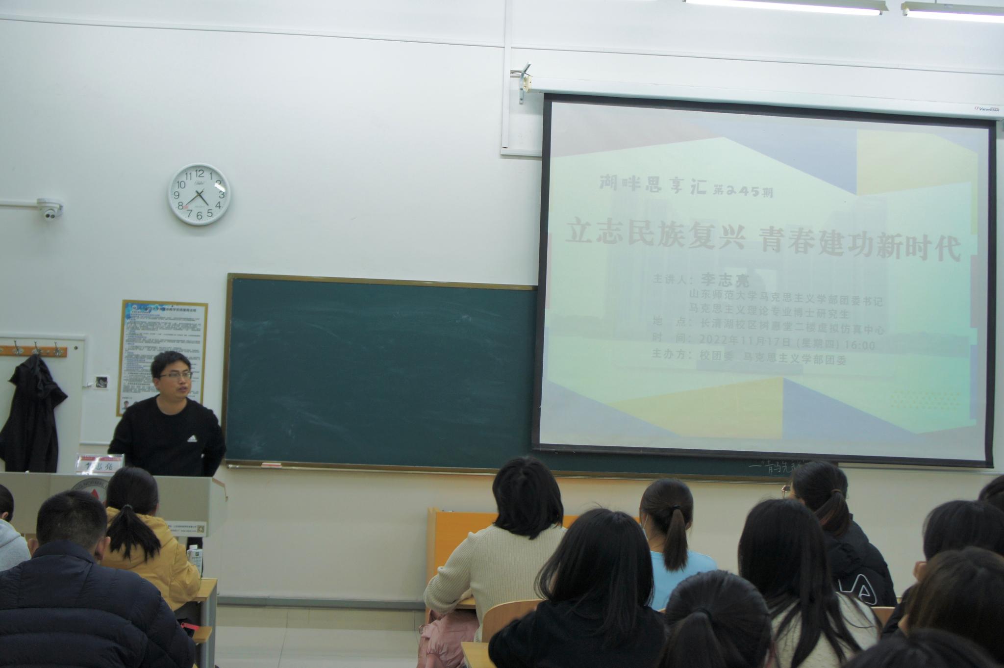 11月17日下午,由校团委、马克思主义学部团委共同主办的湖畔思享汇之“立志民族复兴,青春建功新时代”分享交流会于长清湖校区正德楼108教室举行。会议由山东师范大学马克思主义学部团委书记李志亮主讲,一百余名同学积极与会。