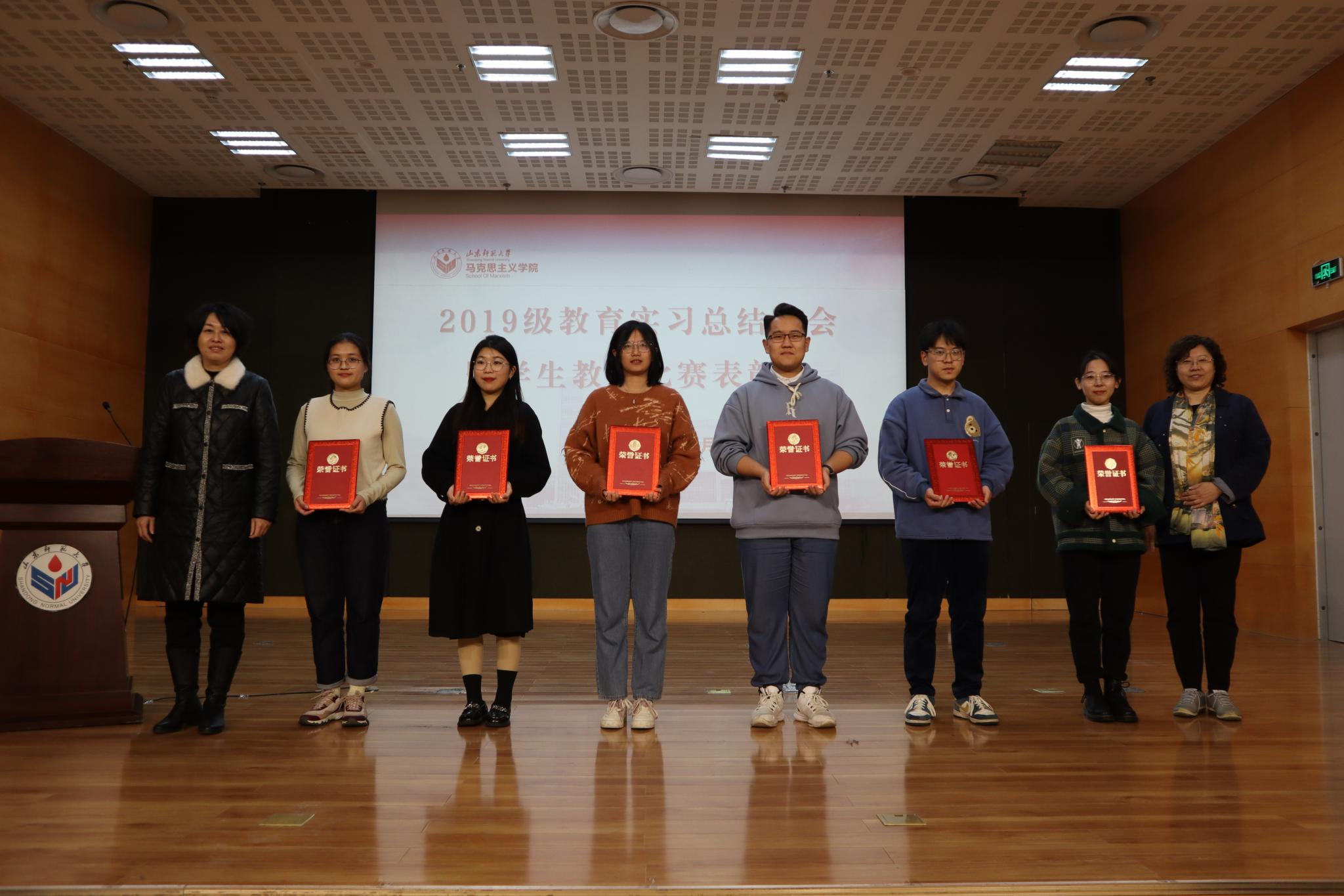 杨光、孙通分别宣读了《2019级教育实习成绩优秀学生名单》《2019级教育实习先进个人名单》,吕晓勇为教育实习先进个人代表颁奖。潘科、邵长超分别宣读了《山东师范大学首届“大学生讲思政课”公开课比赛获奖学生名单》《2021年师范类学生从业技能比赛获奖学生名单》,宋惠芳、王青、孙天蕾、孙爽为获奖学生颁奖。
