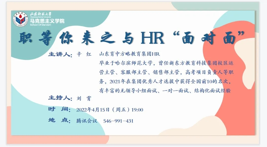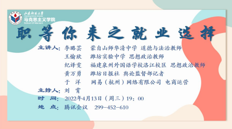 为积极响应山东团省委“青鸟计划”号召,切实推进2022届本科毕业生就业工作,提高学院学生就业能力,4月13日至4月15日,马克思主义学院于腾讯会议平台开展“职等你来”毕业生就业帮扶系列线上讲座。