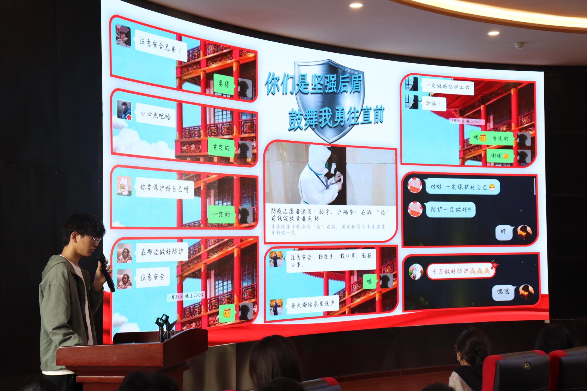 卢瑞华结合亲身经历,与在场学子分享了抗疫服务中的难忘瞬间。首先,他从青年担当,家人支持等方面阐述了主动报名参加志愿服务的初衷。紧接着,他以多张聊天截图展现了来自老师、同学们的热切关怀,他讲到:“尽管抗疫环境恶劣,但学院老师和同学们对我的关心让我有了坚定的决心,他们是我坚强的后盾。”最后,卢瑞华勉励在场学子要承担起青年学子的使命担当,向阳而生,为国家的抗疫工作做出应有的贡献。抗疫故事分享结束后,2020级思政三班盘燕燕同学深有感触,她表示:“青年学子是国家的未来和希望,我必不忘初心,主动承担起青年一代的使命和担当。”