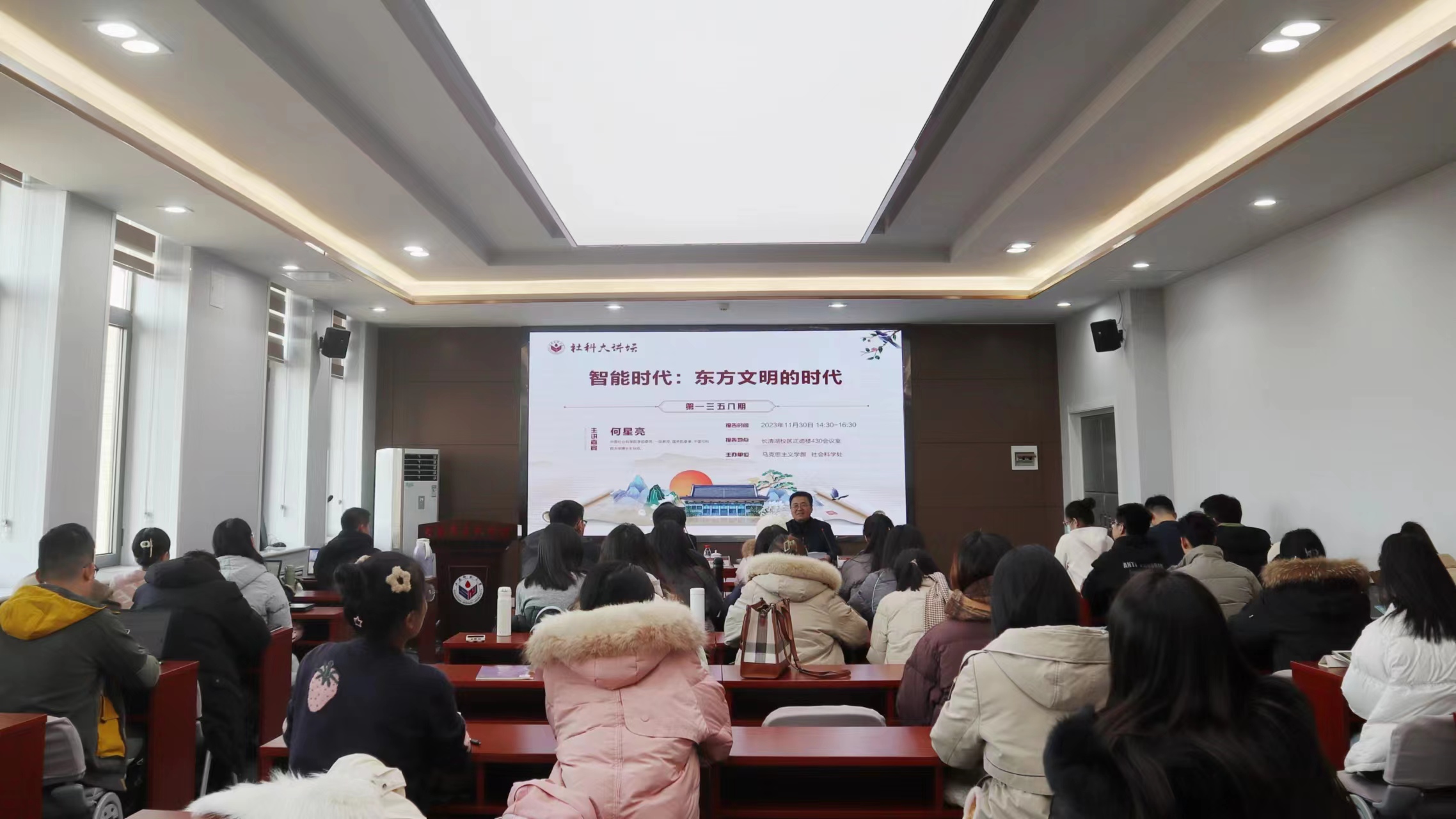 11月30日下午,由马克思主义学部与社会科学处联合举办的第1358期社科大讲坛于长清湖校区正德楼430会议室开讲。本次大讲坛特邀中国社会科学院学部委员、一级教授,国务院参事,中国社科院大学博士生导师何星亮担任报告会主讲人,作了题为“智能时代:东方文明的时代”的学术报告。本次报告会由学部教授董振平主持,百余名学部师生到场聆听。