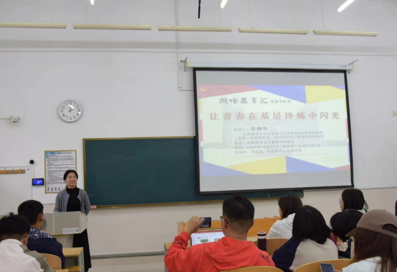 10月19日下午,由校团委、马克思主义学部团委共同主办的湖畔思享汇之“让青春在基层淬炼中闪光”分享交流会于长清湖校区正德楼108教室举行。马克思主义学部2020级学科教学(思政)专业研究生张婧怡担任主讲人,二百余名同学积极与会。