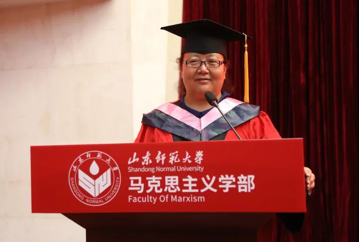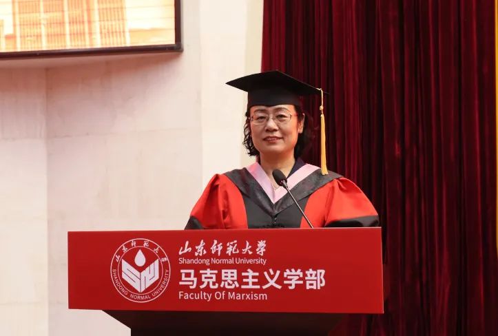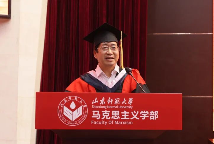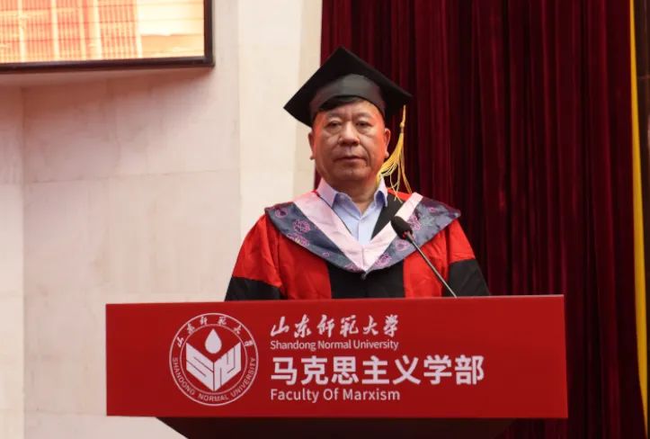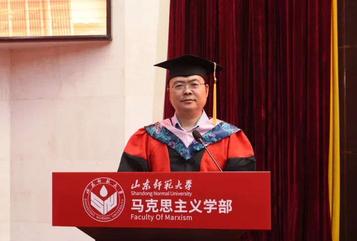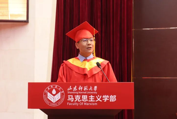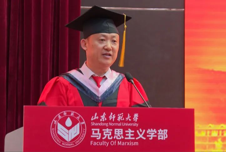 学院院长王增福回顾了学院入选全国重点马克思主义学院以来取得的标志性成果与历史性成就,感谢历代马院人的艰辛付出与当代马院人的奋力拼搏。他深情寄语全体毕业生,面对荆棘丛林能够向阳而生,面临惊涛骇浪能够自立自强,面对物欲诱惑能够理性自律,做中华历史的讲授者、中华文化的传承者、社会主义的接班人、中国共产党的捍卫者,希望同学们能时刻关注身心健康、家庭氛围,学会压力释放、自我调适,在浮躁的时代做一个内心沉静之人,永葆一份本真的状态,创造自己的美好人生。