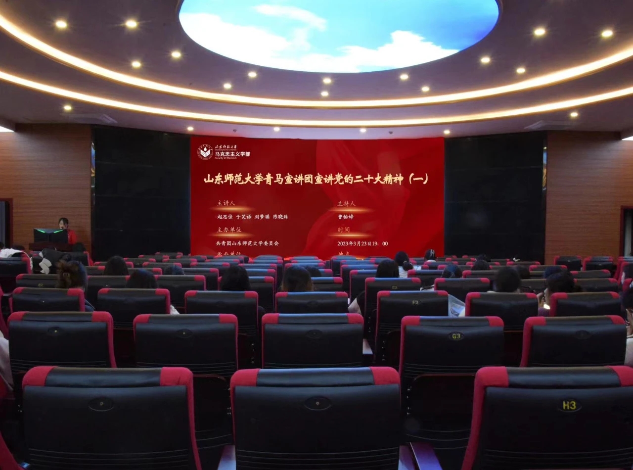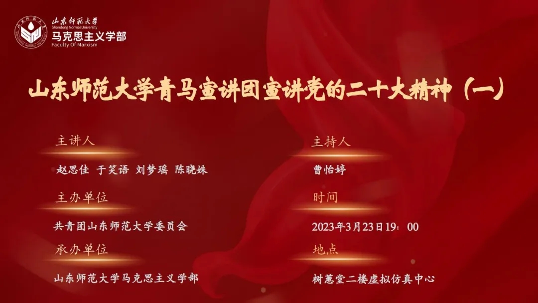 3月23日晚,由共青团山东师范大学委员会主办、山东师范大学马克思主义学部承办的山东师范大学青马宣讲团宣讲党的二十大精神(一)在树蕙堂二楼虚拟仿真中心顺利举行。本次宣讲会由山东师范大学青马宣讲团成员曹怡婷同学主持,山东师范大学青马宣讲团成员赵思佳、于笑语、刘梦瑶、陈晓姝四位同学围绕中国式现代化这一主题开展宣讲,马克思主义学部共100余人参与本次宣讲会。