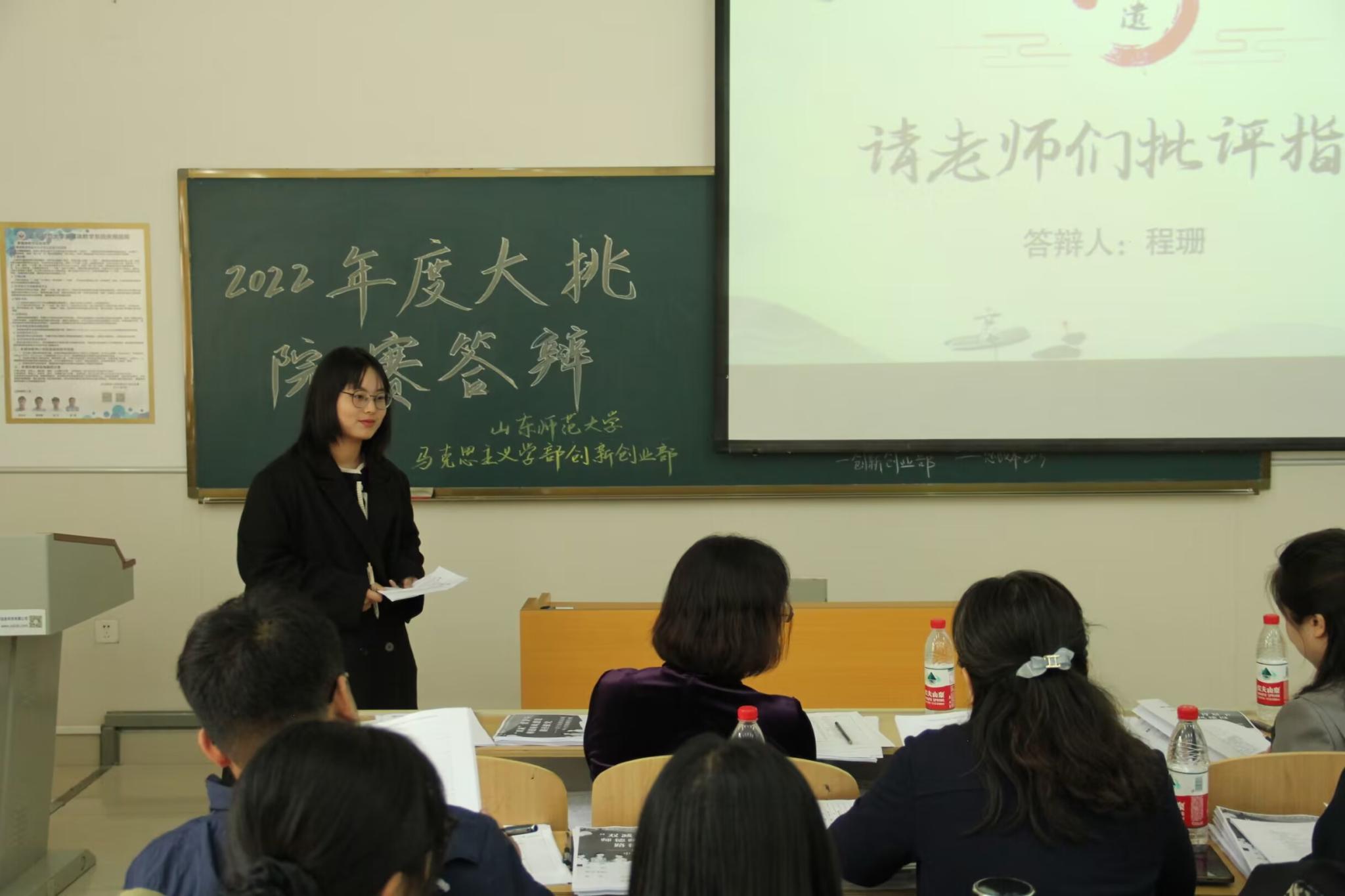 10月20日下午,马克思主义学部于长清湖校区正德楼108教室举办第十八届“挑战杯”山东师大学生课外学术科技作品竞赛院赛答辩会。学部副院长徐稳,党委副书记潘磊,思政系主任、教授王兰芳,副教授孙天蕾,团委书记李志亮担任评委。本次答辩会共有十九个答辩队伍参加。