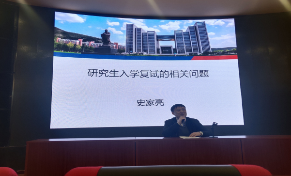 本次活动围绕“鼓足考研干劲,认真落实细节”这一主题展开,主要分为“复试介绍”“答疑解惑”两个部分。大会伊始,史家亮结合多年研究生招考工作经验,从“复试资格的确定”“复试资格的审核”“复试的方式与内容”三个方面完整介绍了考研复试的全部流程。在谈到“复试资格的确定”时,史家亮介绍现在许多高校普遍采取差额复试法,突出强调初试成绩的重要性;紧接着,史家亮明确提出不同的学校会有不同的要求,因此同学们要学会及时关注报考省份的招生考试院以及报考院校的网站,根据官网资讯内容,提前准备好身份证、准考证、学历证书或者证明、学生证、学籍在线验证报告等相关材料。史家亮还特别指出,选带材料中本科阶段的学习成绩单和获奖证书尤为重要,是复试的加分项。在介绍“复试的方式与内容”时,史家亮提到该部分是复试工作的中心环节,主要分为笔试和面试两个方面。笔试考察专业课内容,回答问题要注意层次感和逻辑性,突出专业潜质和专业基础。面试主要考察综合素质与应变能力,遇到陌生题目要学会从容应对,通过复述来帮助自己冷静思考。对于外语听说能力测试,史家亮建议要尽早准备,可以与同学两两配对练习英语对话,并充分利用好网络资源。最后,史家亮针对同学们反馈较多的问题提出了三点建议:一是认真对待,充分准备;二要充满自信,从容应对;三是立足当下,着眼长远。经过近两个小时的交流学习,本次研究生复试经验交流会圆满落下帷幕,同学们纷纷表示获益匪浅。