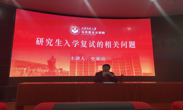 为助力毕业生准备研究生复试,提高复习效率与自信心,1月3日,马克思主义学院于树蕙堂二层召开“满怀自信,充分准备”研究生复试培训讲座。学院副院长史家亮教授担任主讲人,学院学工办主任、团委书记、2017级辅导员潘磊担任主持人,2017级百余名同学积极参与其中。