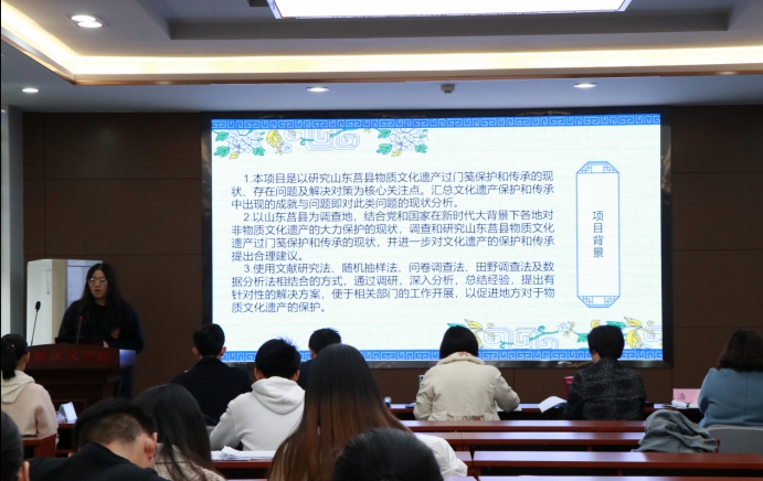 会议伊始,徐稳简要说明本次答辩会流程。随后,各团队答辩人依次上台,用演示文稿展示结合现场解说的形式重点阐述了其研究课题的成果及创新性。2017级思政一班刘译蔓及其团队针对“互联网+高校联盟”如今发展现状及问题提出创新性见解,并展示出团队设计且成功申请国家专利的宣传板。2018级卓思班张欣雨针对新高考下高中生选课问题,基于对山东省济南市的调查研究,于省级刊物发表相关论文。最后,评委们与答辩人展开深入探讨与交流,并针对研究课题中存在的不足给出建议,对于申请延期结项的项目,评委给予了建设性意见。会议结束后,答辩人纷纷表示,本次答辩使团队认识到项目中存在的不足,并加深了对科研创新的了解。